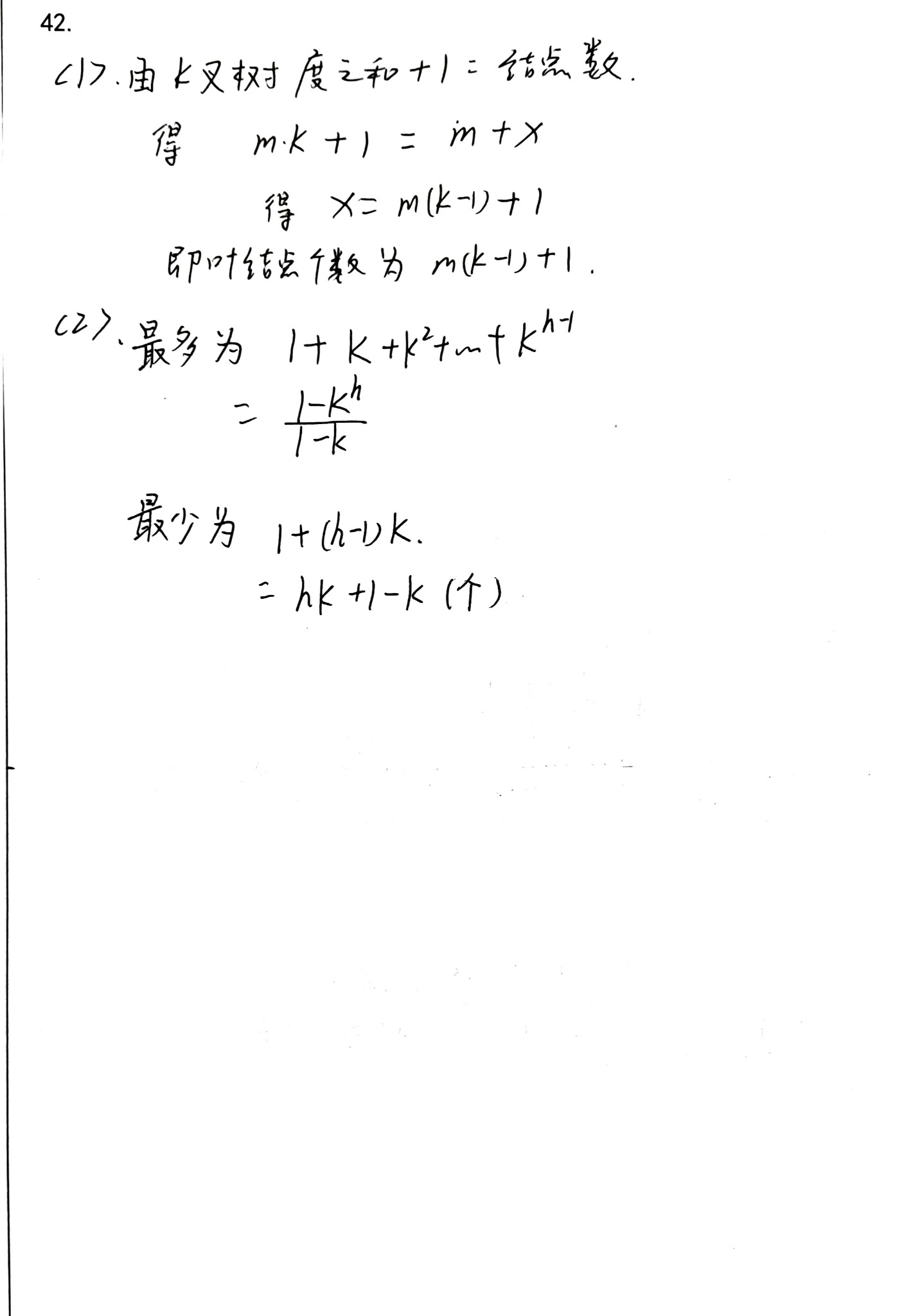 学生正确给出了最多结点数的表达式:1 + k + k² + … + k^(h-1) = (1 - k^h)/(1 - k),与标准答案一致;最少结点数的表达式:1 + (h - 1)k = hk + 1 - k,也与标准答案一致。推导过程虽然简洁,但关键步骤正确,且结果无误。因此得5分。