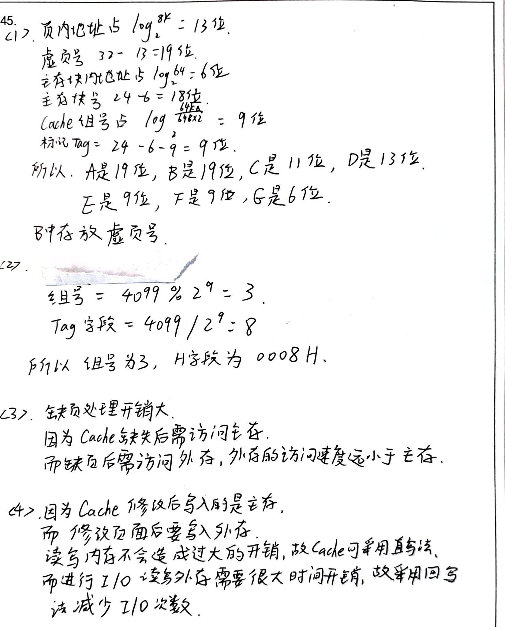 正确指出缺页处理开销大,得1分。理由解释正确(Cache缺失访问主存,缺页访问磁盘),得1分。本小题共得2分。