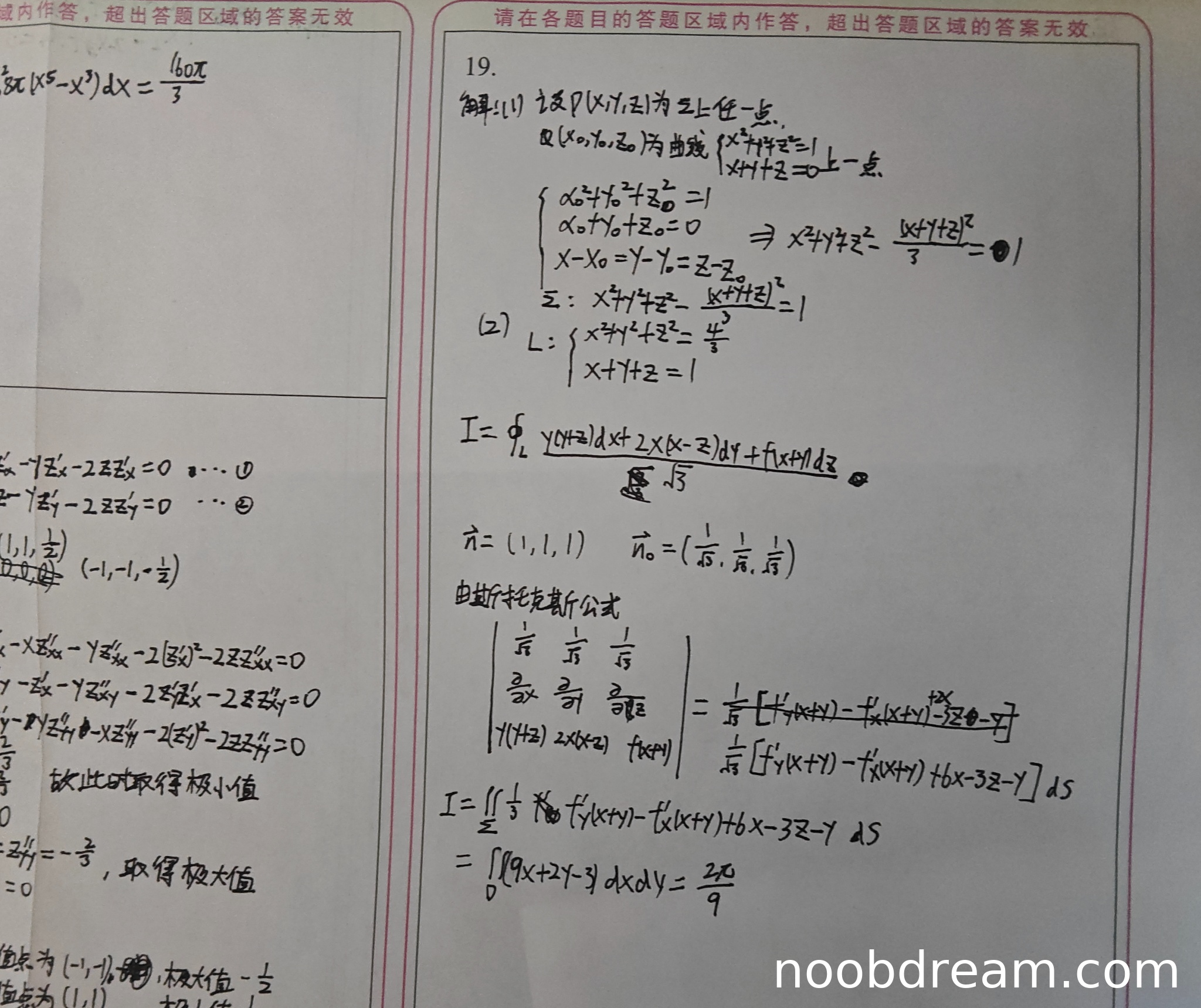 学生作答在第1次识别中,曲线积分表达式中被积函数分子第一项写为 \(y(x+z)dx\),而题目中是 \(y(y+z)dx\),此处属于关键错误,导致后续计算全部错误。此外,第2次识别结果中,被积函数第三项写为 \(z(x+y)dz\),而题目中是 \(f(x+y)dz\),这属于严重错误。虽然学生尝试使用斯托克斯公式,但由于被积函数写错,后续旋度计算、曲面积分均错误。尽管最终答案 \(\frac{2\pi}{9}\) 与标准答案一致,但这是巧合,过程存在根本性逻辑错误。因此该部分得0分。