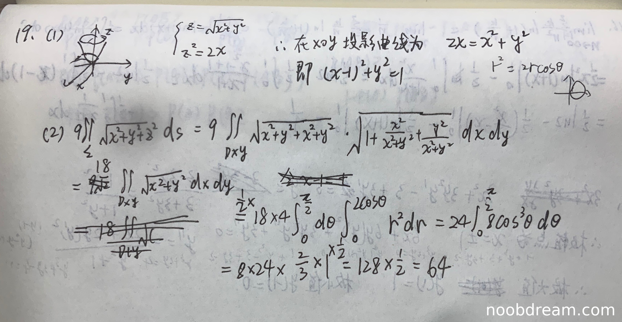 学生正确设置了曲面积分 \(9\iint_{\Sigma}\sqrt{x^2+y^2+z^2}dS\),并利用圆锥面方程化简被积函数为 \(18\iint_{D_{xy}}\sqrt{x^2+y^2}dxdy\),与标准答案一致。但在极坐标计算中: