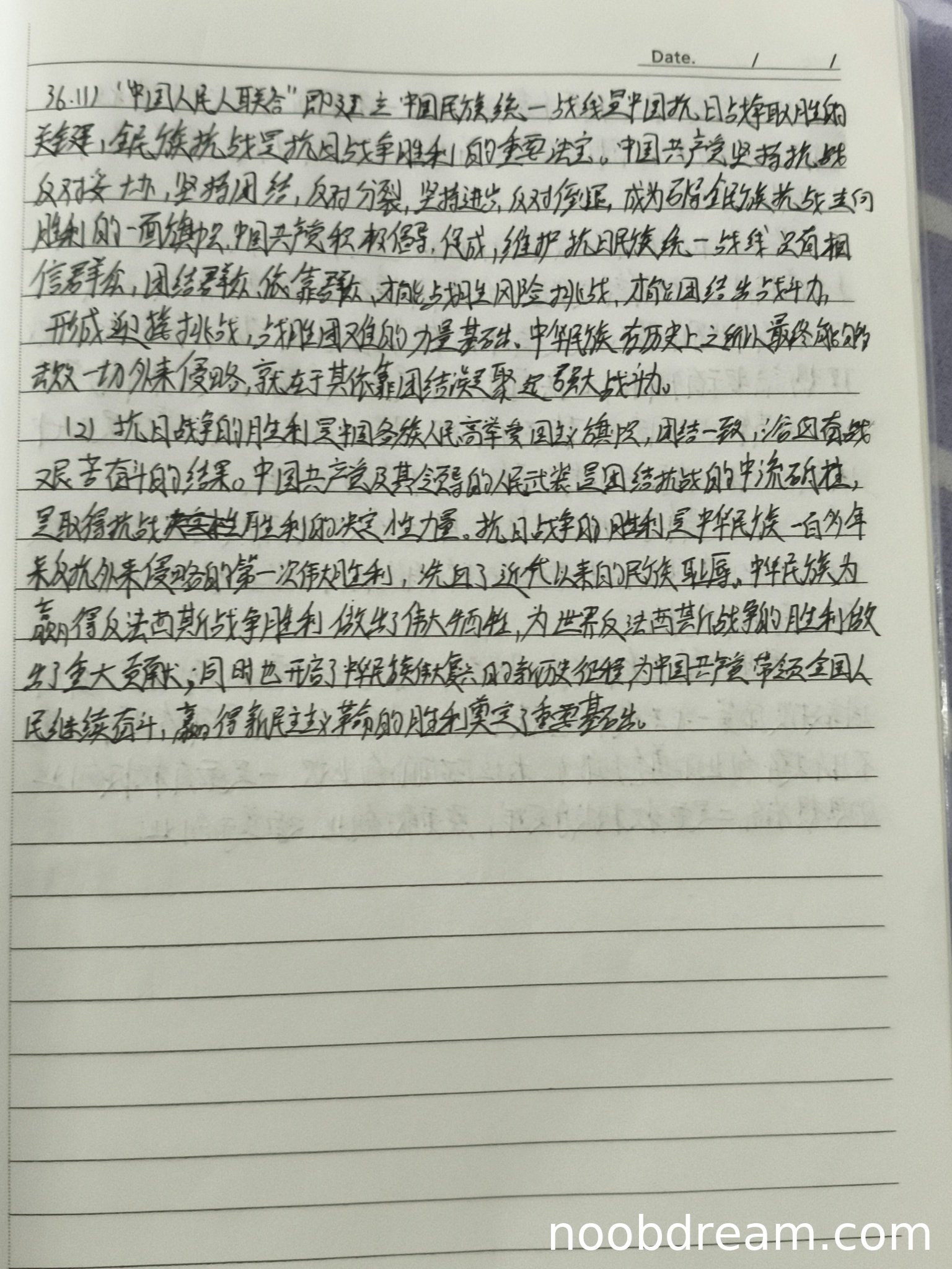 第1次识别结果:答案准确复述了标准答案的核心要点,包括"中国人民大联合"即抗日民族统一战线是胜利关键、全民族抗战是重要法宝、中国共产党三个"坚持"和三个"反对"的立场、依靠群众团结战斗、团结凝聚战斗力等关键内容。仅有个别词语差异(如"与敌人风险挑战"应为"战胜风险挑战"),但不影响核心逻辑。得5分。