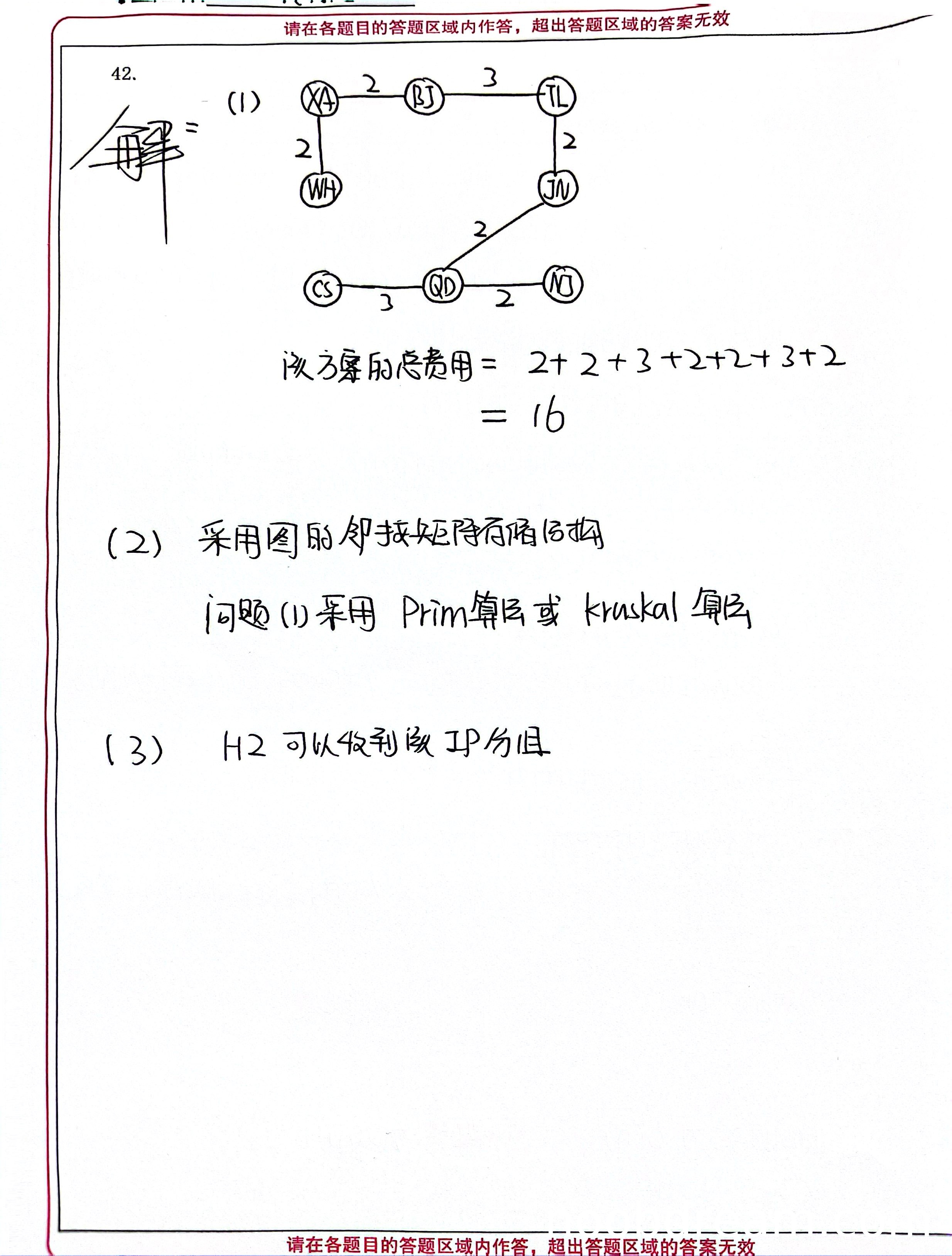 学生给出了总费用16,与标准答案一致,且计算过程正确。虽然学生未具体画出最小生成树的图形,但题目要求"给出所有可能的最经济的光缆铺设方案(用带权图表示)",学生仅给出了费用计算,未完整展示方案。考虑到费用计算正确,且识别结果中可能遗漏了图形部分,给予部分分数。扣1分。