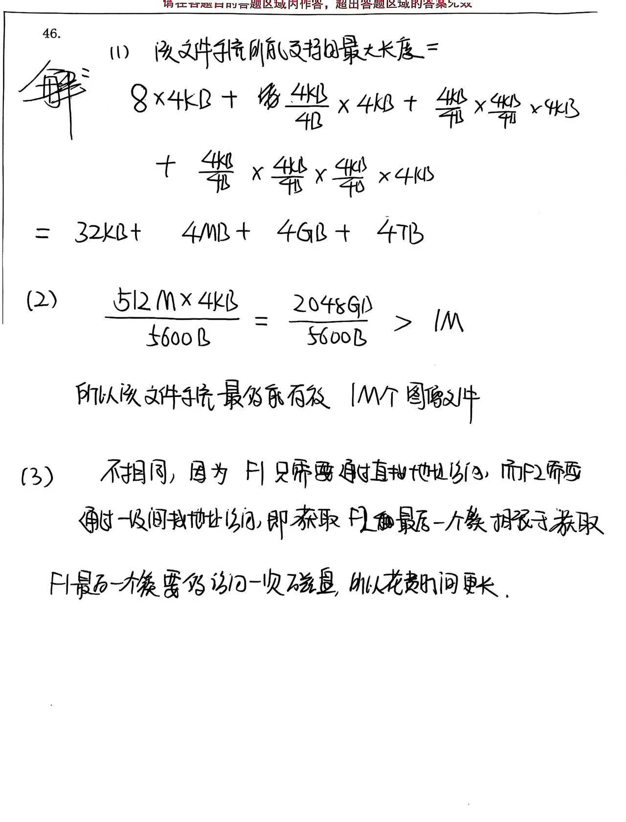 学生答案中计算了数据簇能存储的文件数量为512M×4KB/5600B,并得出结果大于1M,因此结论为最多存放1M个文件。但标准答案指出文件数量还受索引节点数量限制(64M个),学生未考虑索引节点限制,直接得出1M个文件的结论是错误的。此处存在逻辑错误,扣1分。得1分。