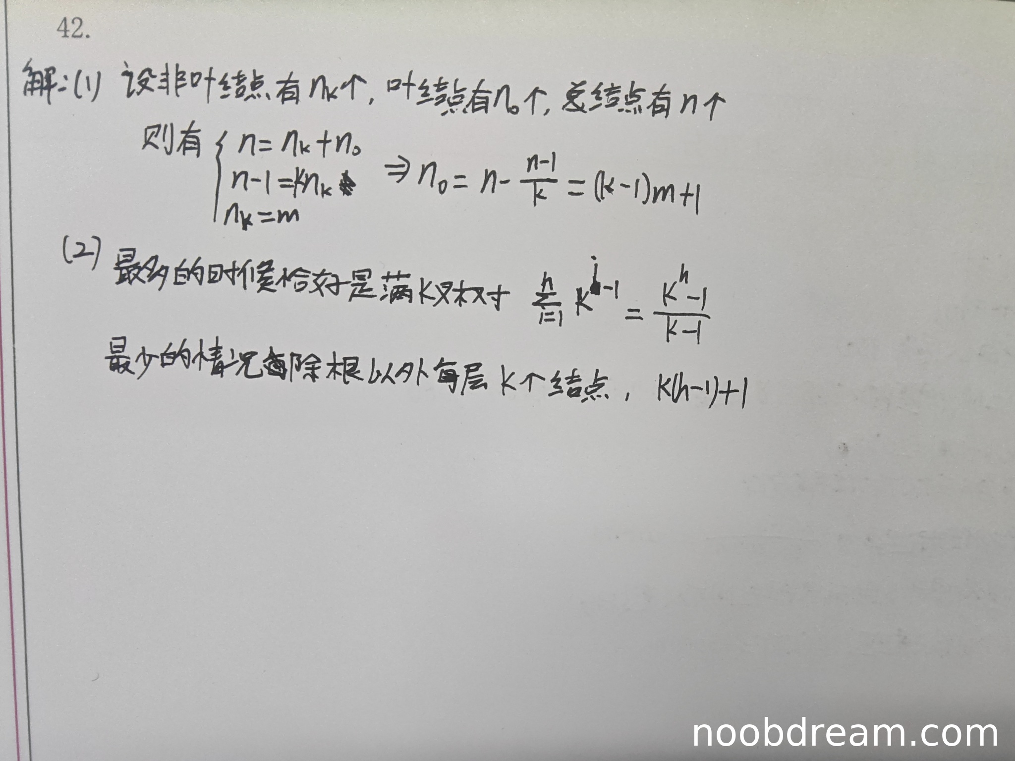 学生正确设置了变量:非叶结点数n_k=m,叶结点数n_0,总结点数n。通过方程组n = n_k + n_0和n - 1 = k·n_k(基于边数关系)推导出n_0 = (k-1)m + 1。推导过程完整且正确,与标准答案一致。得3分。