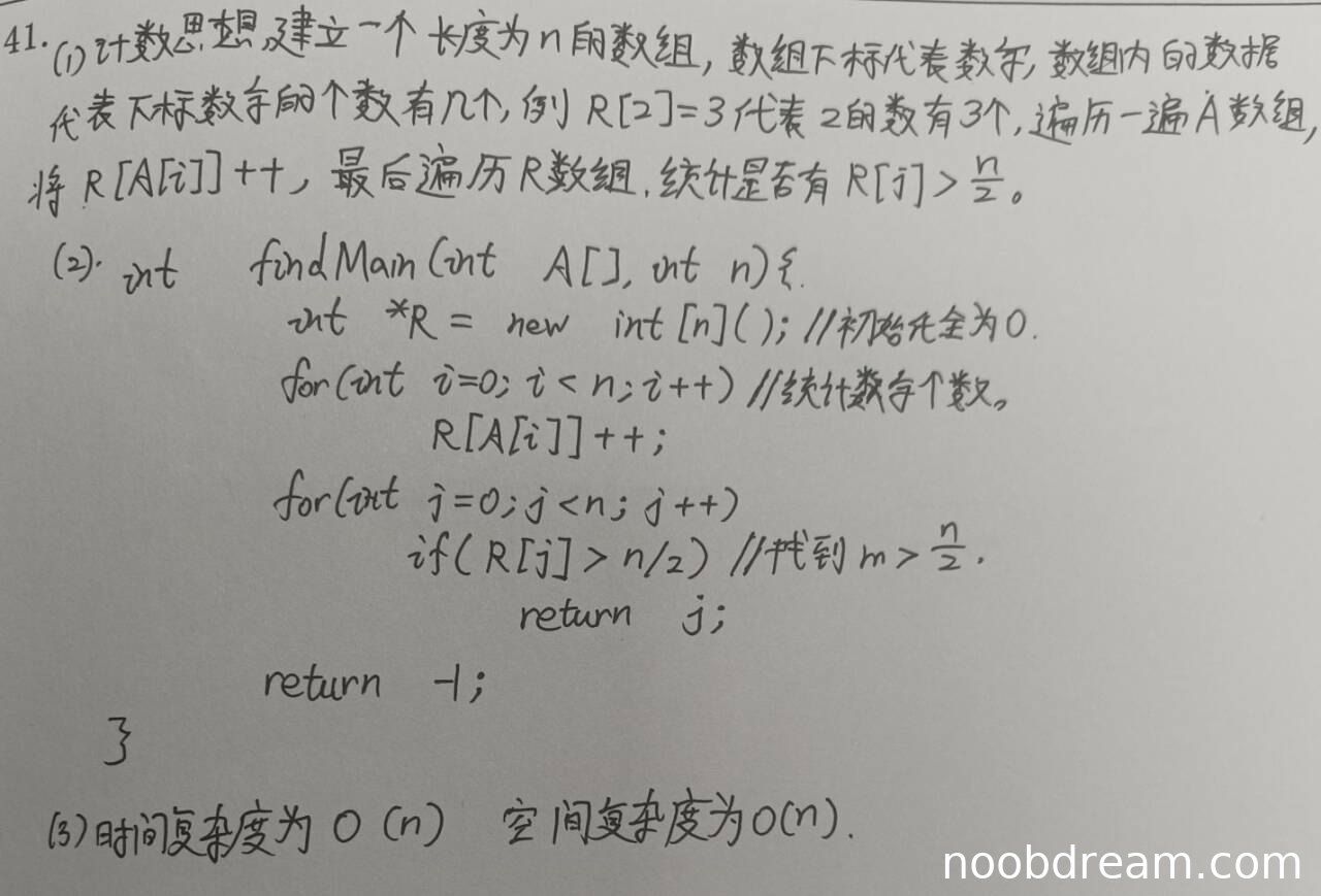 理由:学生的算法设计思想使用了一个长度为n的计数数组来统计每个数字出现的次数,然后遍历计数数组找到出现次数超过n/2的元素。这种方法能够正确找出主元素,思路正确,但相比标准答案的摩尔投票法,空间复杂度为O(n)而不是O(1),在空间效率上不如标准答案。考虑到题目要求"尽可能高效的算法",这种解法在空间效率上有所不足,因此扣1分。