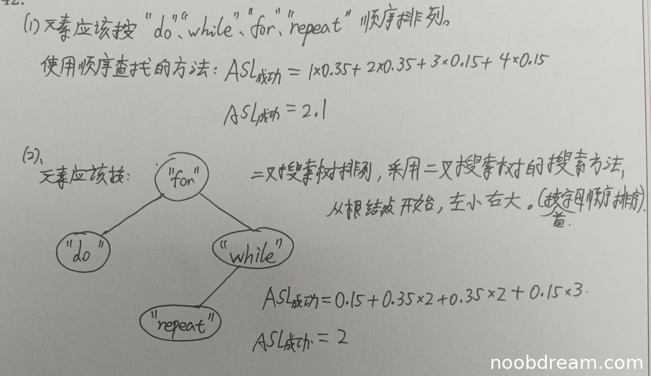学生答案中,元素排列为"do"、"while"、"for"、"repeat",这实际上是将查找概率最高的两个元素(p1=0.35和p4=0.35)放在最前面,符合按查找概率降序排列的原则。采用顺序查找方法正确,计算的平均查找长度2.1正确。与标准答案完全一致,得5分。
