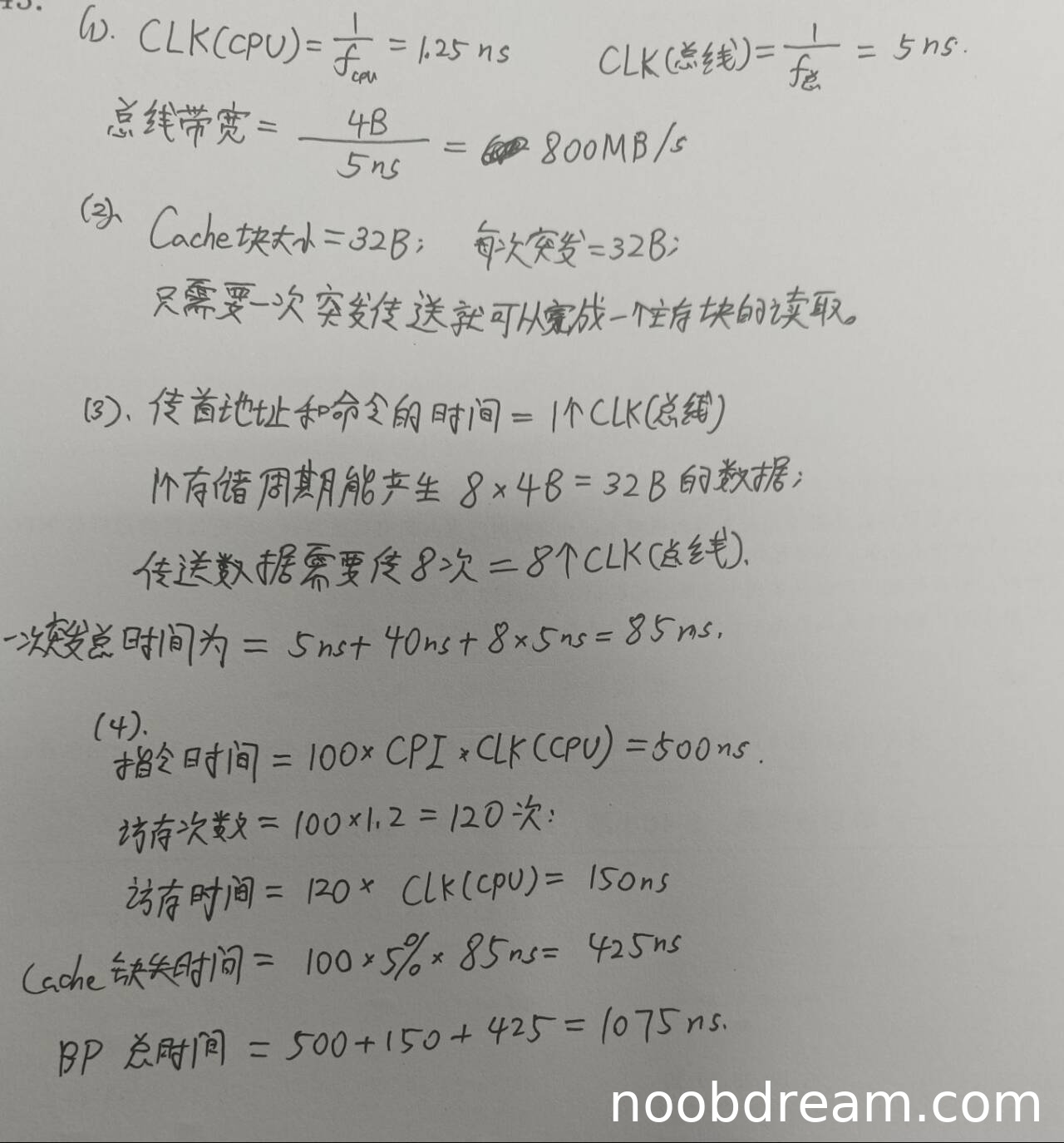学生正确计算了CPU时钟周期(1.25 ns)、总线时钟周期(5 ns)和总线带宽(800 MB/s),与标准答案完全一致。得3分。