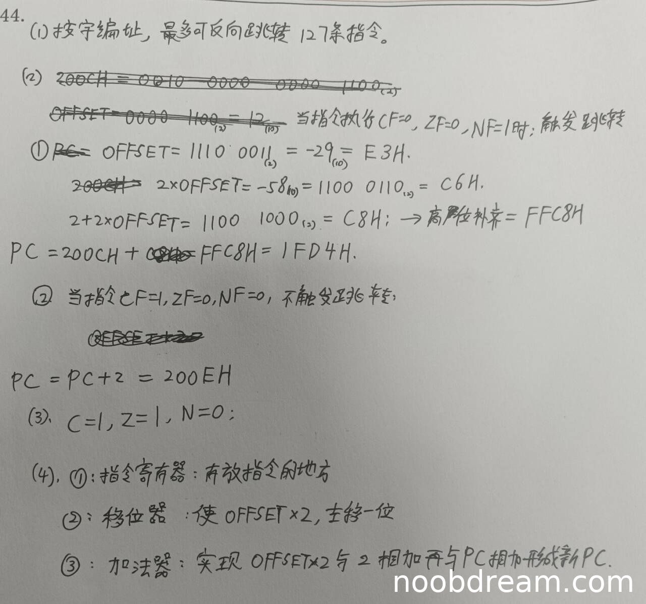 学生回答“按字编址”错误,标准答案为按字节编址。但学生正确识别了偏移量范围为-128~127,并得出向后最多可跳转127条指令。因此,编址部分扣1分,跳转指令数部分得2分。本小题得2分。
