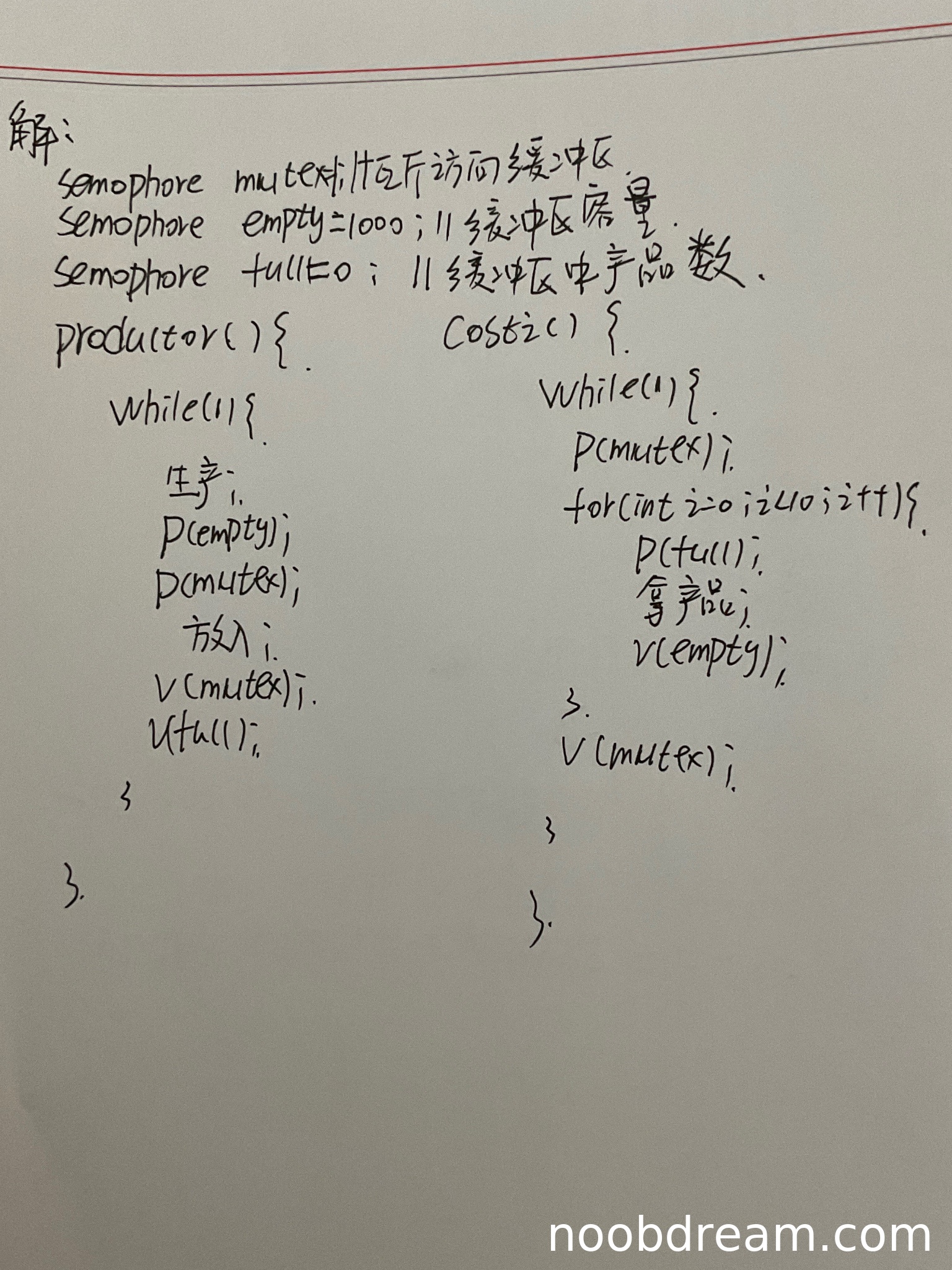 理由:学生定义了三个信号量mutex、empty和full,其中empty=1000和full=0的初值正确,符合生产者-消费者问题的基本要求。但是缺少控制消费者连续取10件的互斥信号量(标准答案中的mutex1),且mutex信号量未赋初值(应为1)。因此扣1分。