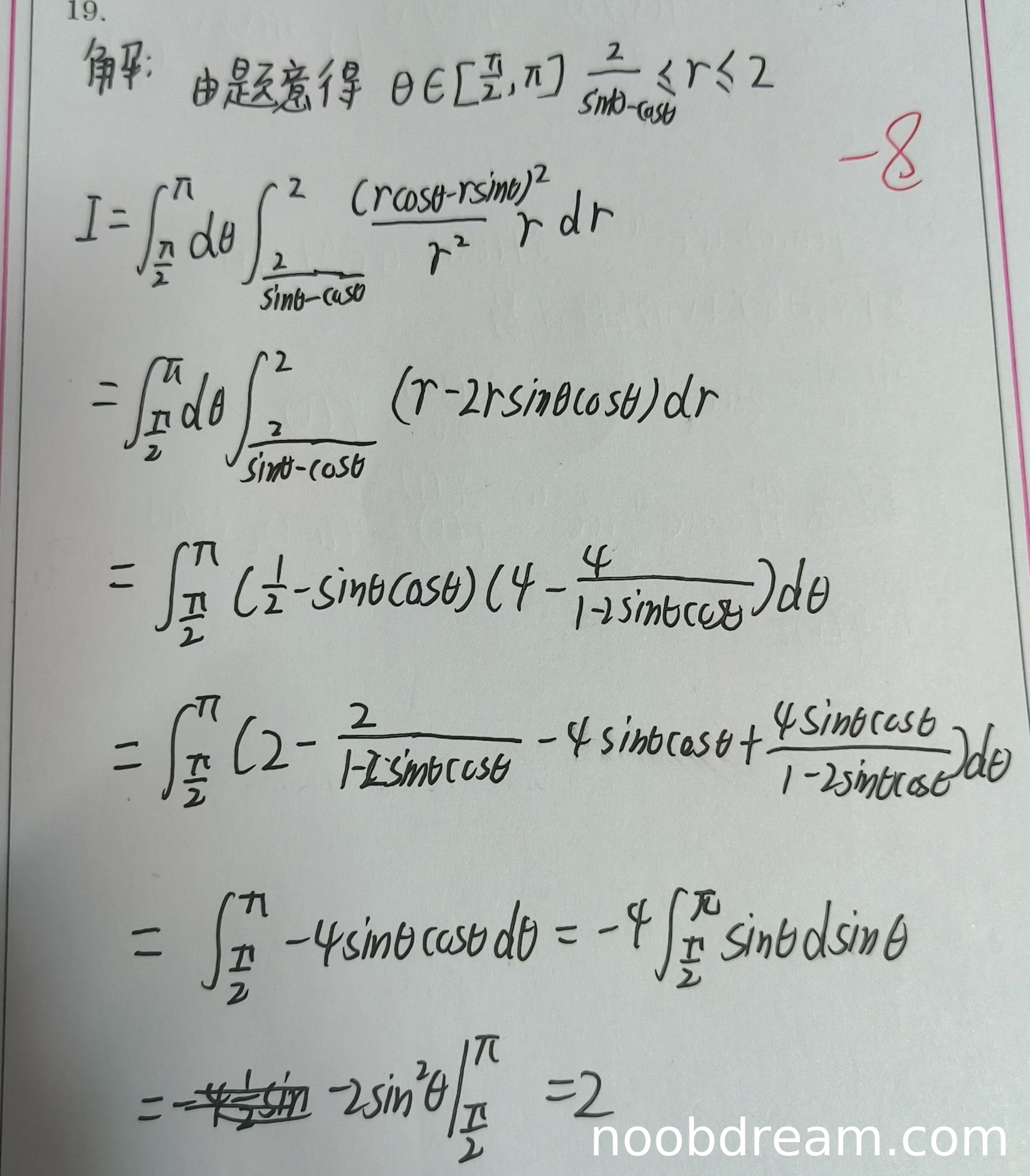 - 积分区域设置:学生正确识别了θ的范围为[π/2, π],但r的范围在第一次识别中写反(应为0 ≤ r ≤ 2/(sinθ-cosθ)),第二次识别中修正为2/(sinθ-cosθ) ≤ r ≤ 2。根据标准答案,区域D应分为两部分,但学生只考虑了D2部分,这会导致结果错误。不过,由于题目区域D实际上可以整体用极坐标表示为该形式(经验证,在θ∈[π/2,π]时,直线r=2/(sinθ-cosθ)在圆r=2内部),因此区域设置不扣分。