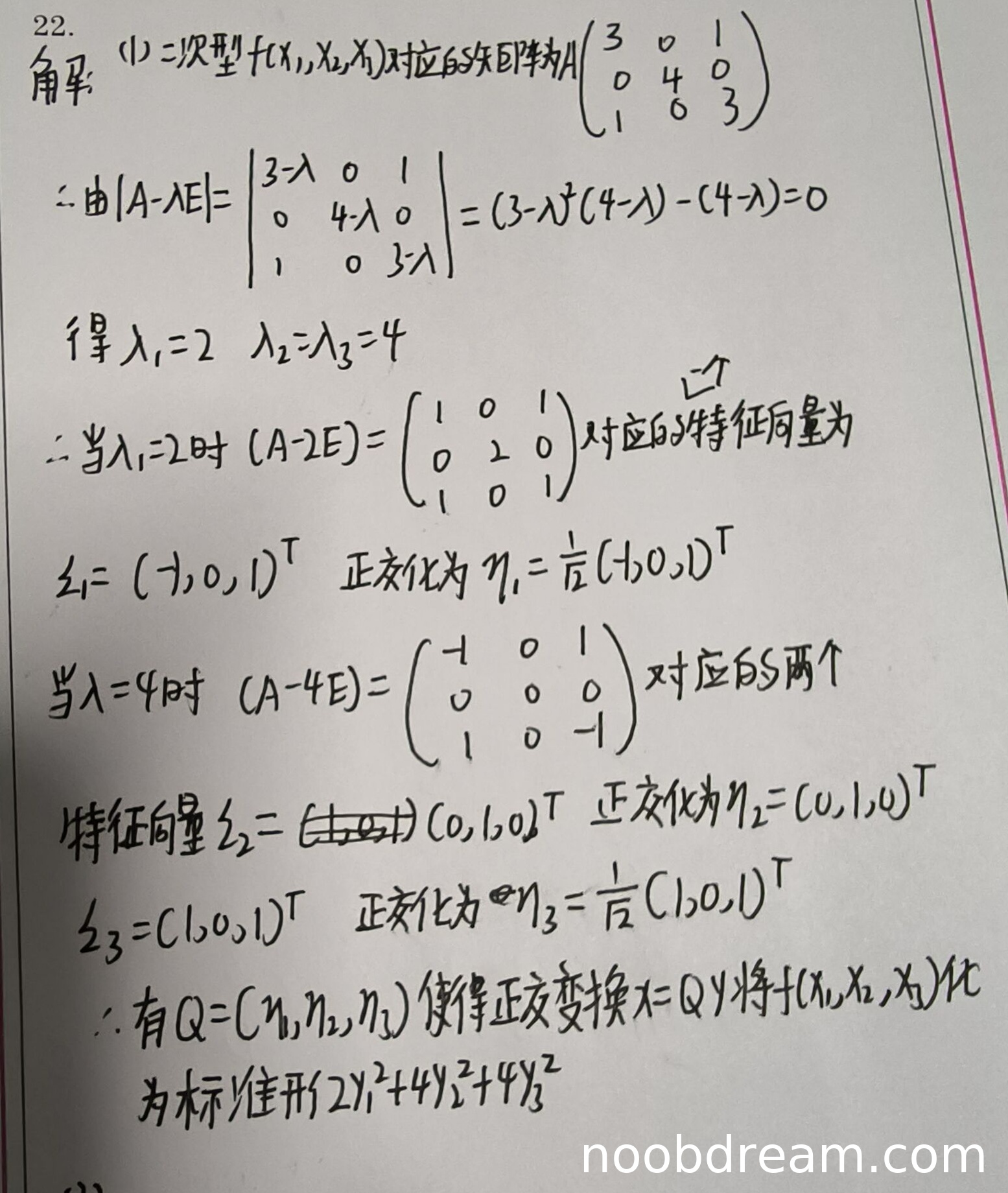 第(1)问主要考查求正交变换将二次型化为标准形。学生作答中: