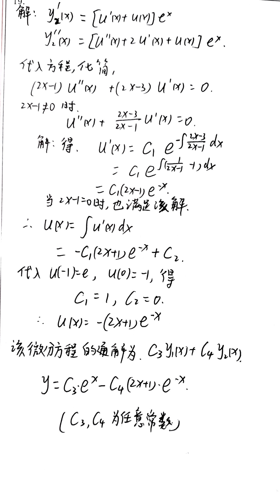 学生正确计算了y₂'和y₂'',代入原方程后化简得到关于μ的微分方程(2x-1)μ''+(2x-3)μ'=0,这与标准答案等价(标准答案为(2x-1)μ''=(3-2x)μ',两者实质相同)。在解这个方程时,学生正确使用了积分因子法,得到μ'(x)=C₁(2x-1)e^{-x},积分得到μ(x)=-C₁(2x+1)e^{-x}+C₂。利用初始条件μ(-1)=e和μ(0)=-1,正确求出C₁=1,C₂=0,最终得到μ(x)=-(2x+1)e^{-x},与标准答案一致。该部分逻辑完整,计算正确,得5分。