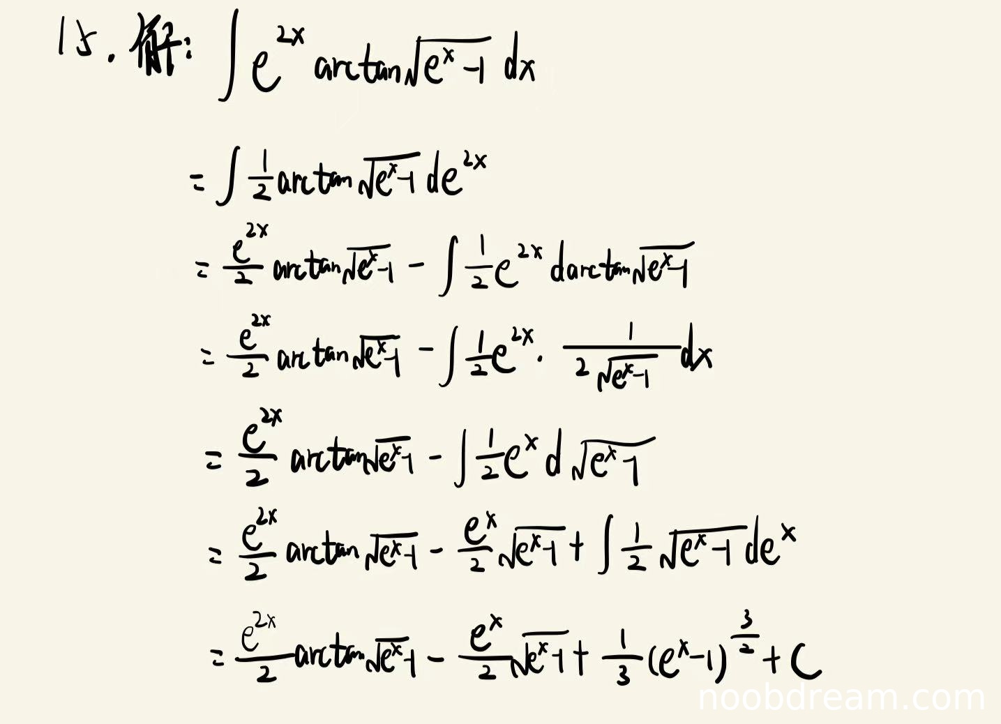 学生正确使用了分部积分法,设u=arctan√(e^x-1),dv=e^(2x)dx,步骤与标准答案一致。得2分。