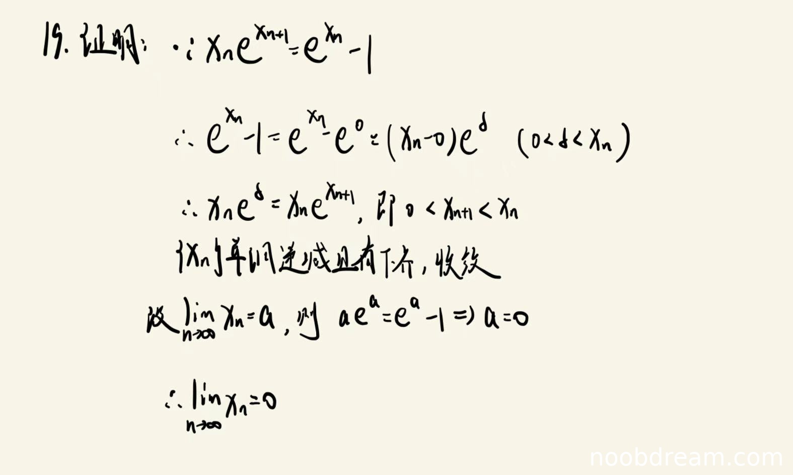 学生正确应用了拉格朗日中值定理于函数 \(f(x) = e^x\),得到 \(e^{x_n} - 1 = x_n e^{\delta}\) 其中 \(\delta \in (0, x_n)\),并与给定递推关系 \(x_n e^{x_{n+1}} = e^{x_n} - 1\) 比较得出 \(e^{\delta} = e^{x_{n+1}}\),从而得到 \(x_{n+1} = \delta < x_n\),证明了数列严格单调递减。同时注意到 \(x_1 > 0\) 且所有 \(x_n > 0\),说明数列有下界。这部分论证完整正确。