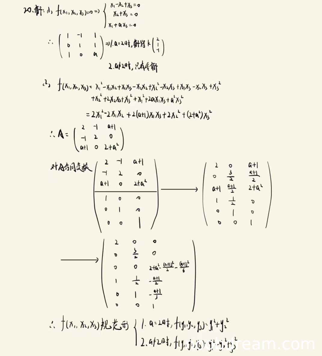 学生正确展开二次型并写出矩阵,但在规范形部分存在以下问题: - 当a≠2时,第二次识别结果给出y₁²-y₂²+y₃²,这是错误的规范形(应为y₁²+y₂²+y₃²) - 合同变换过程混乱,最后未正确化简 - 但最终a=2时的规范形判断正确 由于核心思路正确但结果有误,扣2分。得分3.5分。