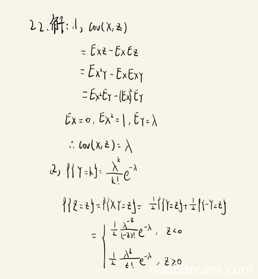 学生作答(a)部分完全正确。正确使用了协方差公式Cov(X,Z)=E(XZ)-E(X)E(Z),并利用X与Y独立、E(X)=0、E(X²)=1、E(Y)=λ等条件,得出Cov(X,Z)=λ。计算过程清晰,逻辑严谨,与标准答案一致。因此得满分5.5分。