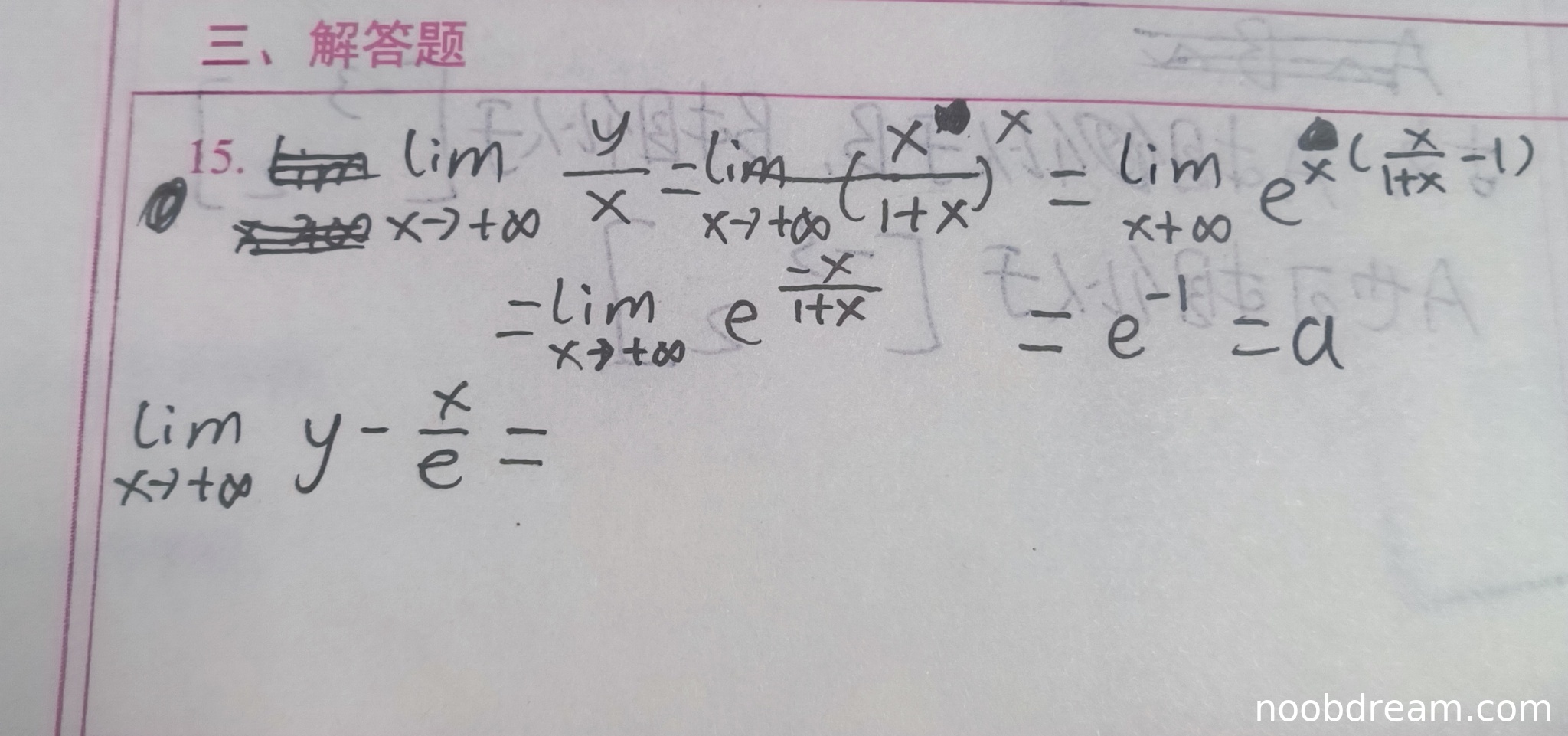 学生正确计算了斜率k = limx→+∞ y/x = 1/e,得5分。虽然计算过程中使用了近似ln(1-1/(1+x)) ≈ -1/(1+x),但在极限计算中这是合理的,最终结果正确。