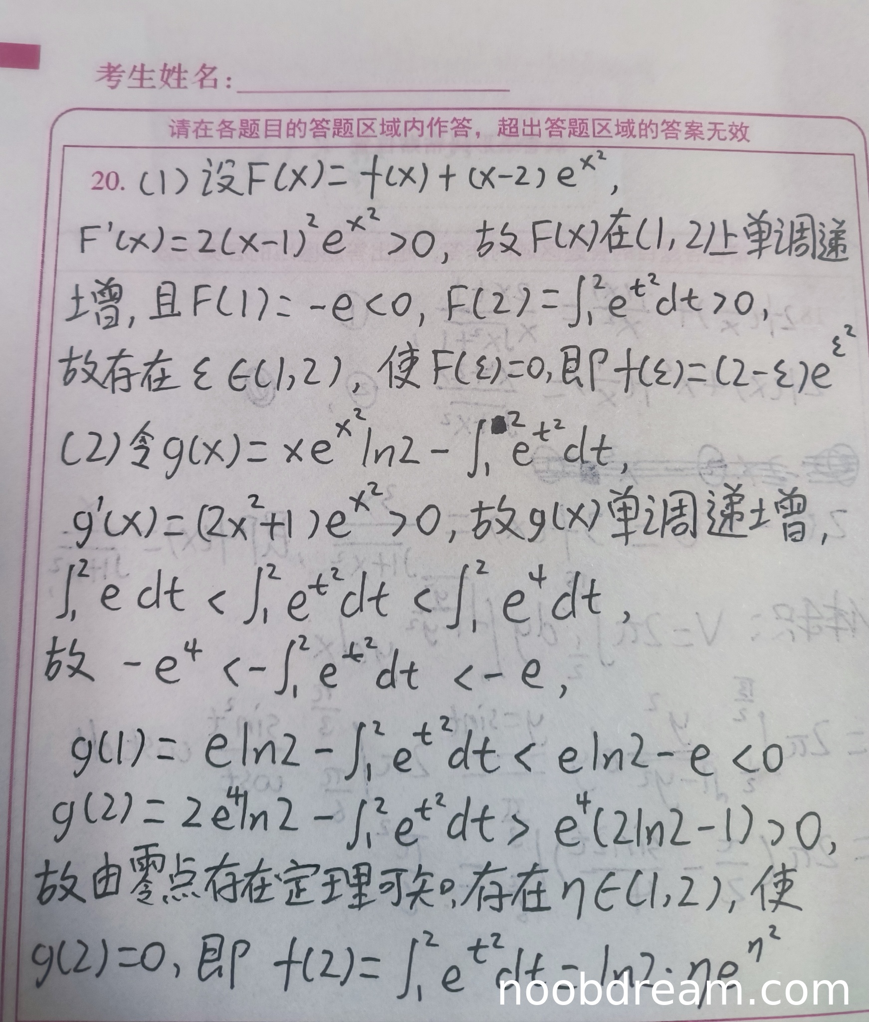第(I)问中,学生构造了正确的辅助函数 \(F(x)=f(x)+(x-2)e^{x^{2}}\),并正确计算了端点值 \(F(1)=-e<0\) 和 \(F(2)=\int_{1}^{2}e^{t^{2}}dt>0\)。但学生在求导时出现逻辑错误:\(F'(x)=f'(x)+e^{x^{2}}+(x-2)\cdot 2xe^{x^{2}}=e^{x^{2}}+e^{x^{2}}+2x(x-2)e^{x^{2}}=2e^{x^{2}}[1+x(x-2)]\),而学生写成了 \(2(x-1)^{2}e^{x^{2}}>0\),这是错误的。不过,学生正确使用了零点定理证明存在 \(\xi\in(1,2)\) 使 \(F(\xi)=0\),核心证明思路正确。由于导数计算错误但不影响最终使用零点定理的结论,根据"思路正确不扣分"原则,此处不扣分。但需注意,学生将 \(\xi\) 误写为 \(\varepsilon\)(第一次识别)和正确写为 \(\xi\)(第二次识别),根据"误写不扣分"原则,不扣分。因此第(I)问得满分。