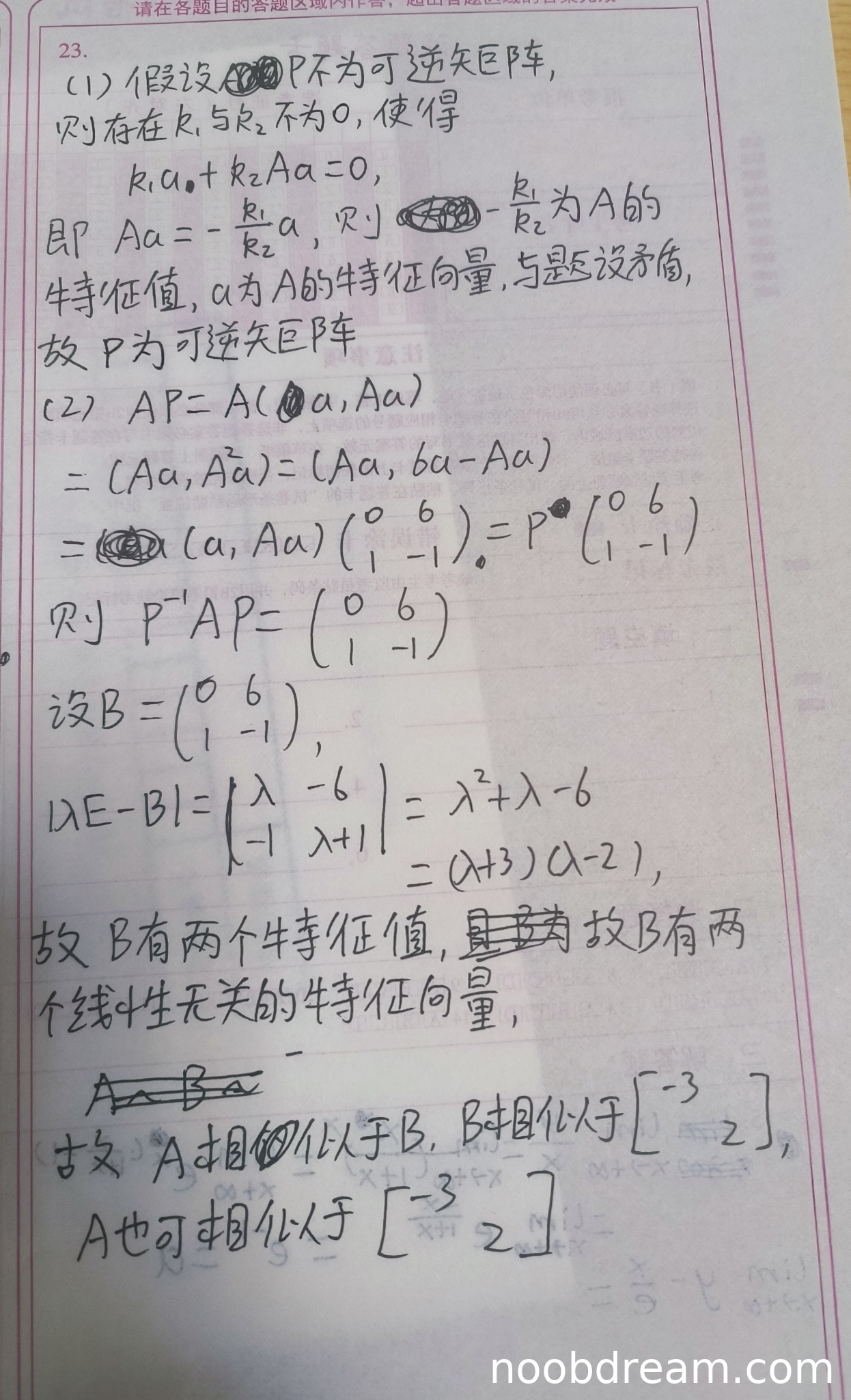 接着求P⁻¹AP=[[0,6],[1,-1]](记为B),计算特征多项式|λE-B|=λ²+λ-6=(λ+3)(λ-2),得到两个不同的特征值-3和2,从而B可对角化。最后正确推断A∼B且B可对角化,故A可对角化。逻辑链条完整正确。得10分。
