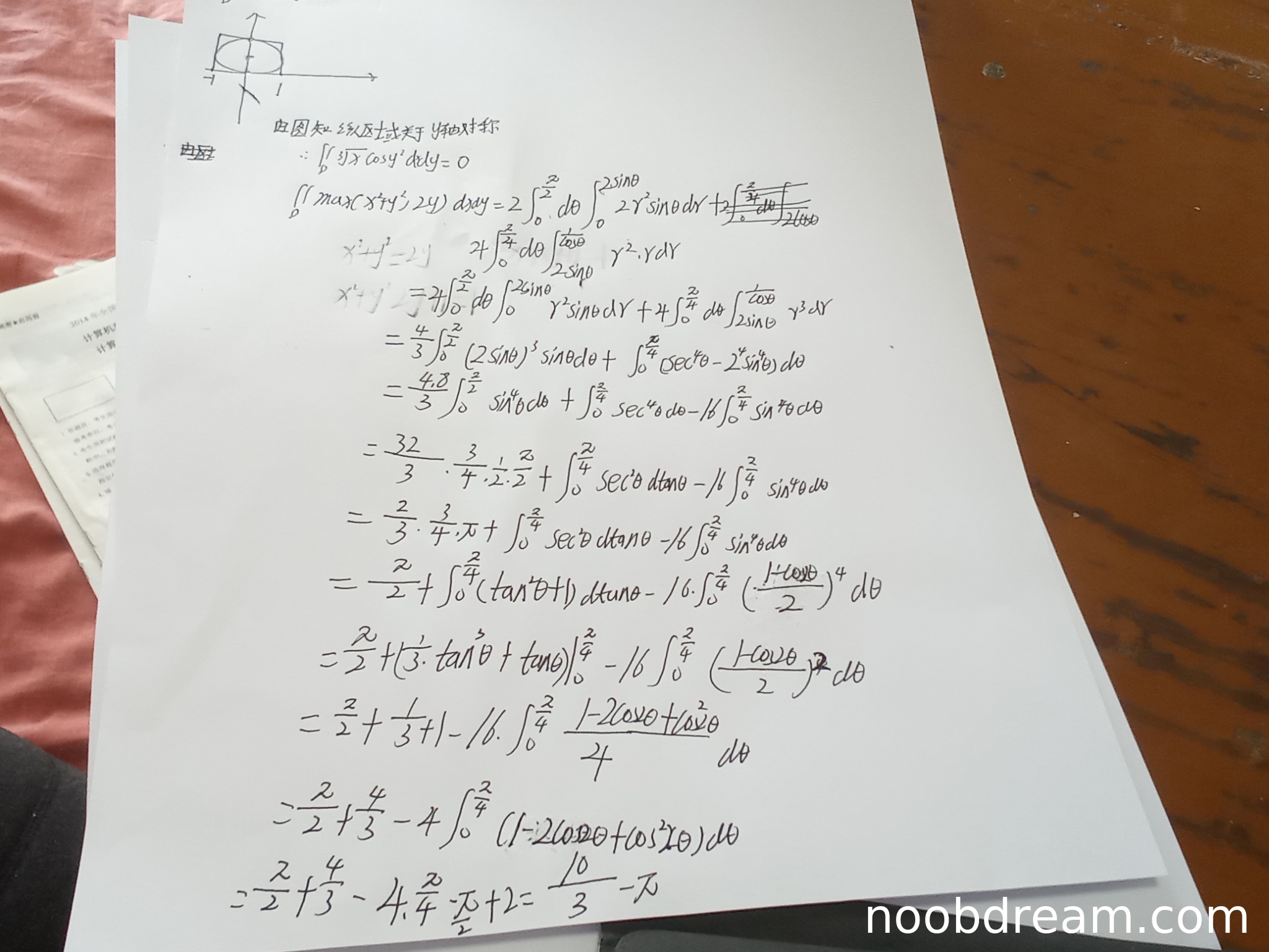 学生在极坐标变换和具体计算过程中存在多处错误:积分限设置错误导致后续计算全部错误;三角函数积分公式使用不当;最终计算结果\(\frac{10}{3}-\pi\)与正确答案\(\frac{\pi}{2}+\frac{20}{3}\)相差很大。虽然计算过程展现了积分技巧,但核心逻辑错误导致结果错误。扣5分,得1分。