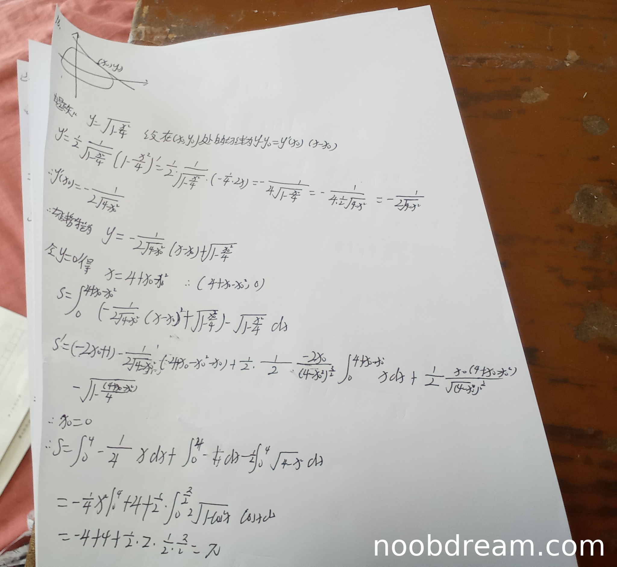 学生尝试用积分表示面积,但表达式基于错误交点和错误曲线方程,且求导过程混乱,最终得到 \( x_0 = 0 \) 和 \( S = \pi \) 的错误结论。未正确建立面积函数并求最值,核心逻辑全错,扣6分,得0分。