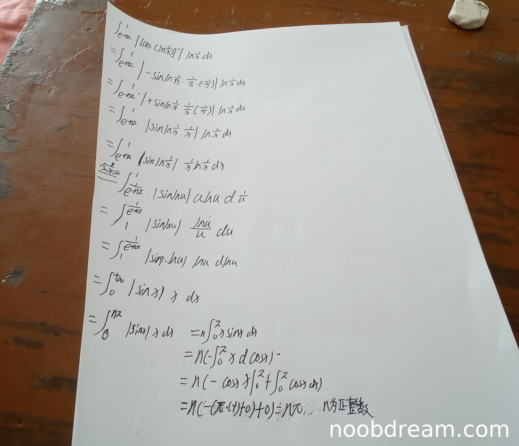 第二步:换元。学生令 \(u = \ln\frac{1}{x}\),正确。但积分上下限在第一个识别版本中写为 \(e^{-n}\)(应为 \(e^{-n\pi}\)),第二个版本正确为 \(e^{-n\pi}\)。换元后积分写为 \(\int_{n\pi}^{0} |\sin u| u du\),正确应为 \(\int_{n\pi}^{0} |\sin u| u (-e^{-u}) du\)?实际上标准做法是 \(dx = -e^{-t} dt\),学生似乎直接写为 \(du\) 形式,但表达式 \(\int_{n\pi}^{0} |\sin u| u du\) 与标准答案一致(差一个负号调整上下限),这里不扣分。