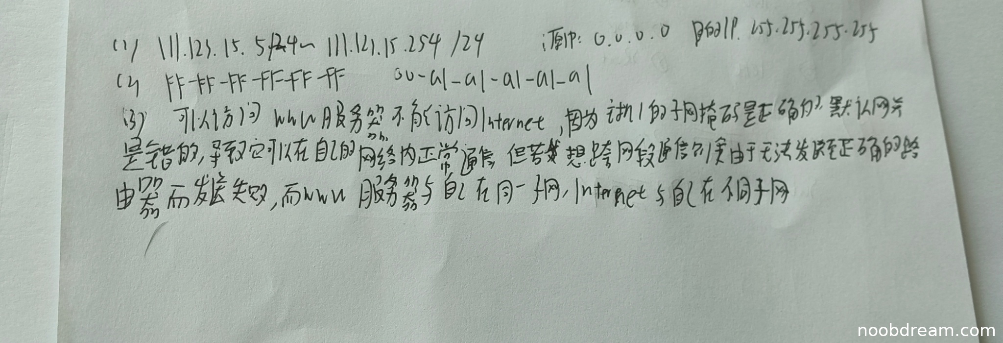 学生正确判断主机1能访问WWW服务器但不能访问Internet,理由解释清晰准确:子网掩码正确但默认网关配置错误,导致同一子网内通信正常但跨网段通信失败。WWW服务器在同一子网,Internet在不同子网。答案与标准答案完全一致。得4分。