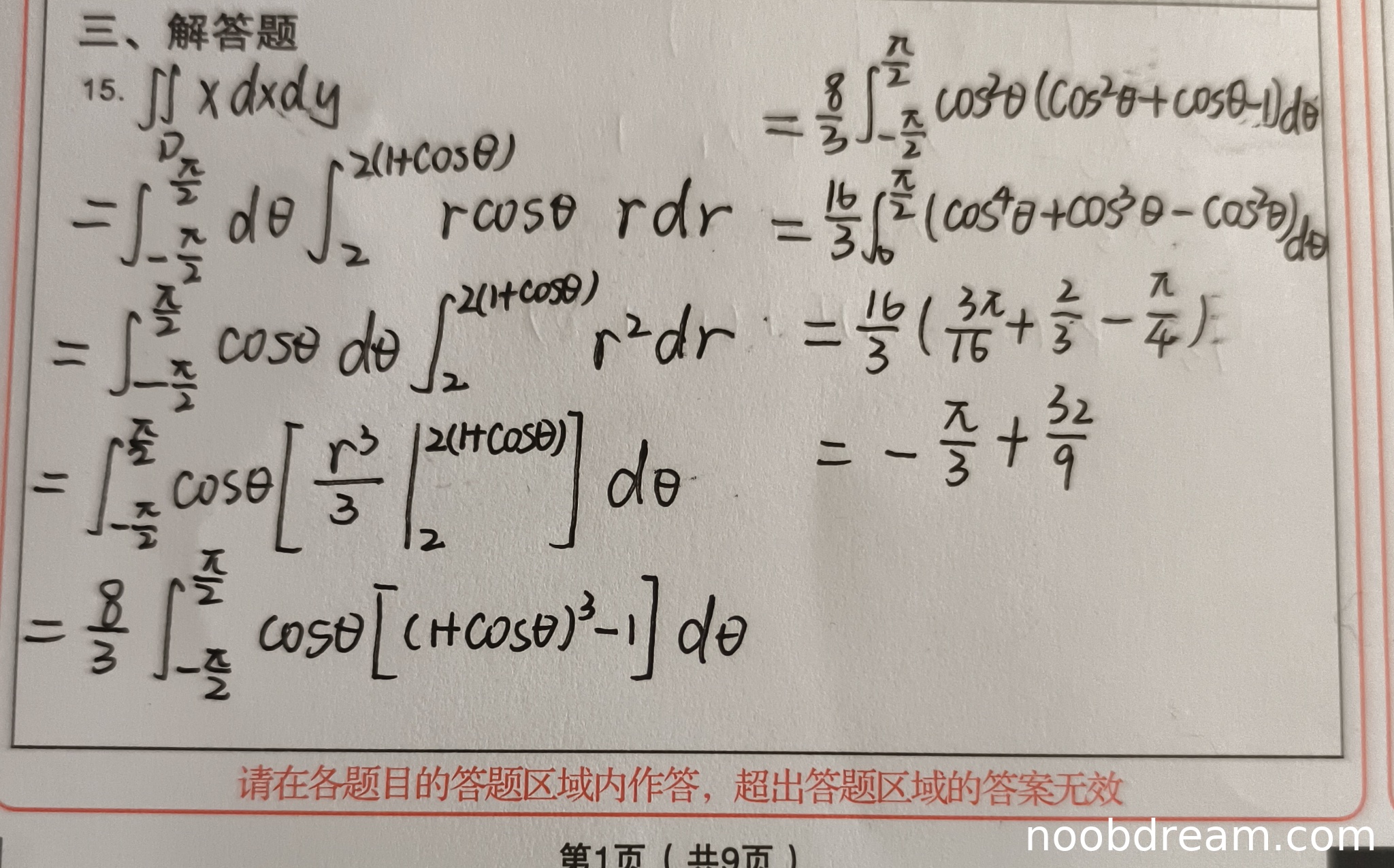 - 逻辑错误:在展开$(1+\cos\theta)^3-1$时出现错误,导致后续计算全部错误(-5分)