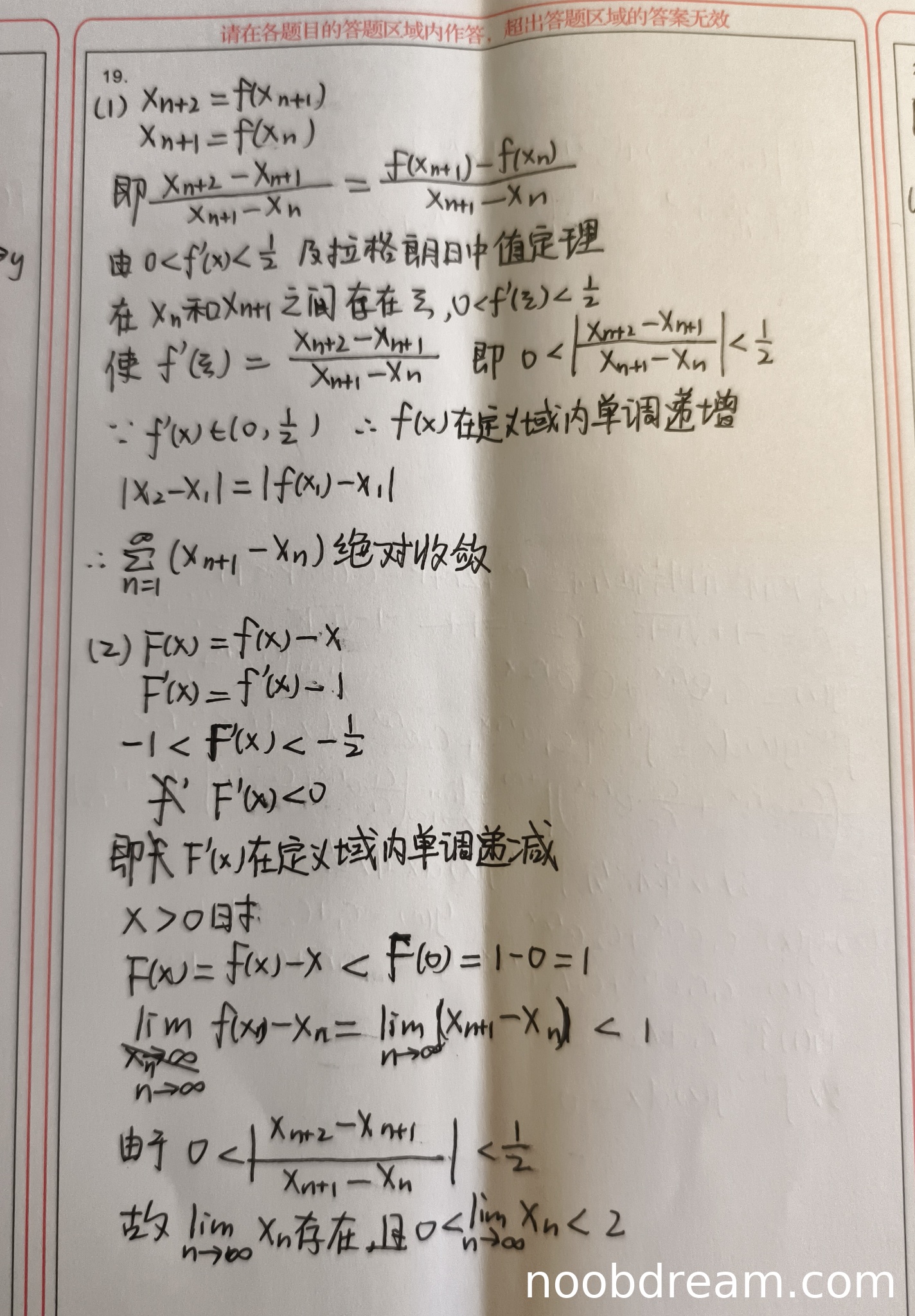学生答案中,通过定义 \(F(x) = f(x) - x\) 并分析其单调性,但未正确利用级数收敛性证明极限存在。标准答案通过级数部分和 \(S_n = x_{n+1} - x_1\) 的收敛性直接得出极限存在。学生答案中错误地写出 \(-1 < f'(x) < -\frac{1}{2}\)(应为 \(0 < f'(x) < \frac{1}{2}\),可能是识别错误),导致后续推导 \(F'(x) < 0\) 和单调性分析无效。此外,学生未证明极限范围 \(0 < A < 2\) 的严格性(如标准答案中的反证法)。因此扣3分,得2分。