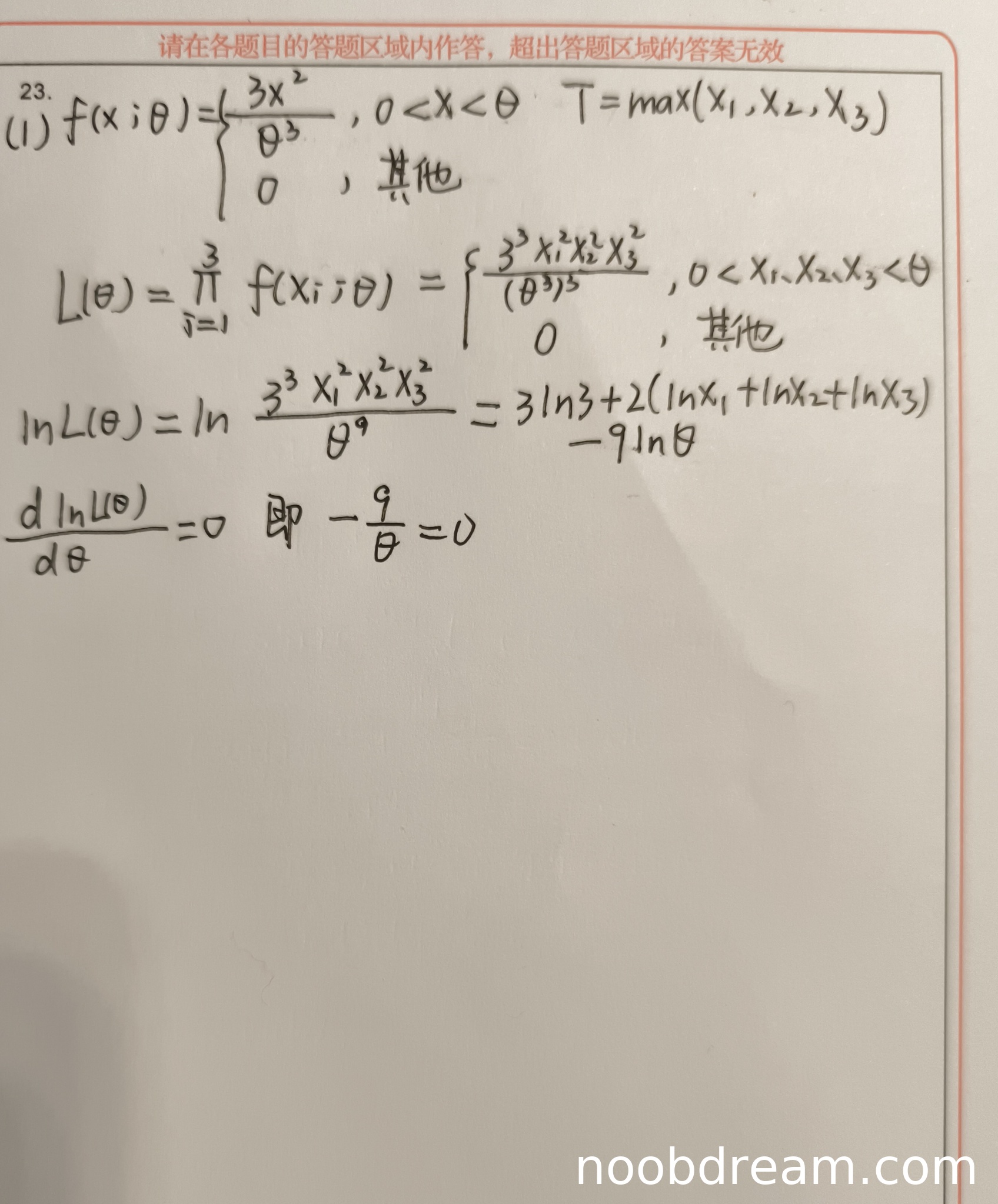 学生作答中完全没有涉及第(1)问求T的概率密度的内容,而是错误地转向了似然函数和极大似然估计的推导。这与题目要求不符,属于逻辑错误。因此,第(1)问得0分。