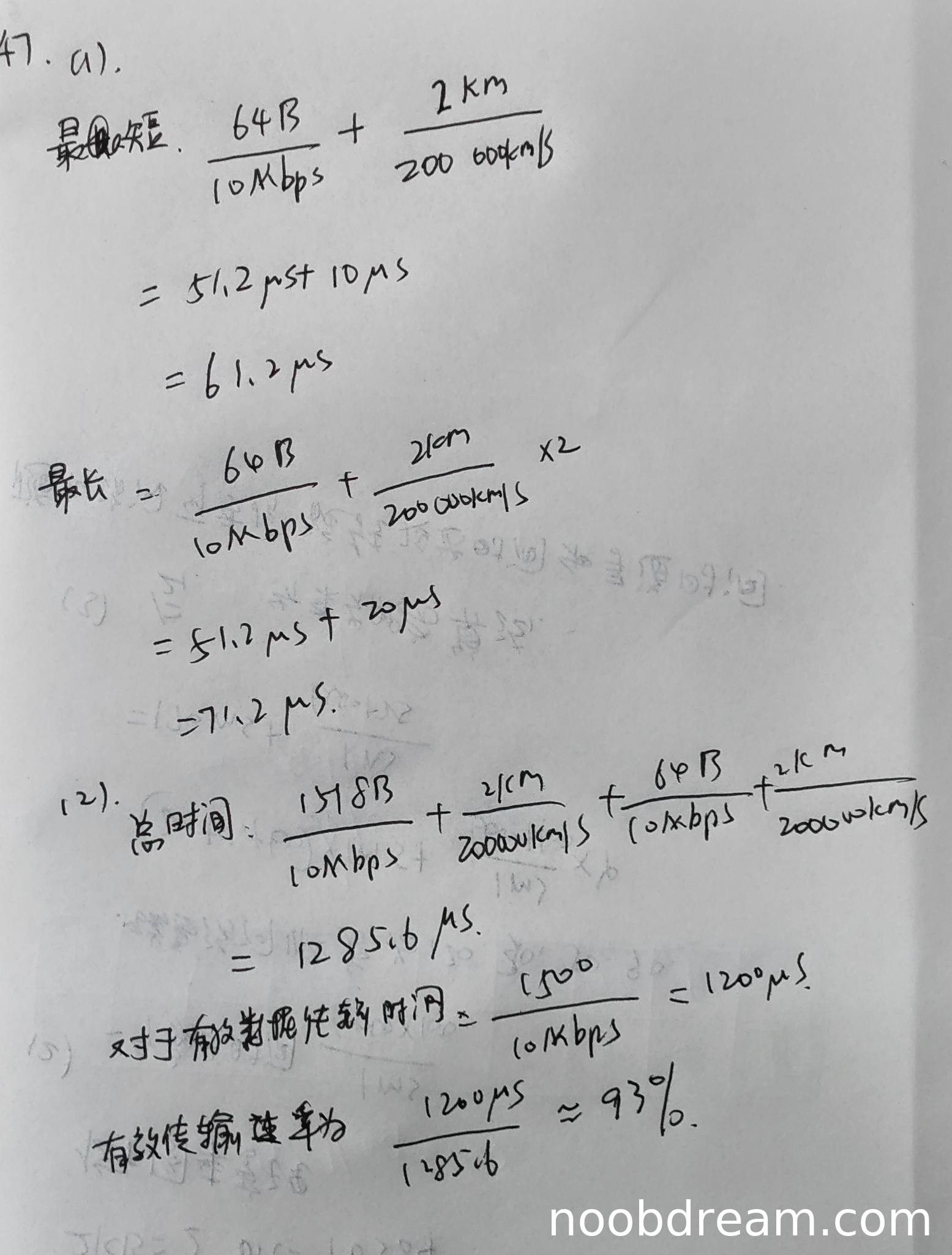 学生答案中计算最短和最长时间时错误地加入了64字节帧的发送时延(51.2μs),而标准答案仅考虑信号传播时延。最短时间应为单程传播时延0.01ms(10μs),学生计算为61.2μs;最长时间应为双程传播时延0.02ms(20μs),学生计算为71.2μs。核心逻辑错误在于未理解CSMA/CD冲突检测的本质是传播时延而非帧发送时延。但学生正确识别了最短为单程、最长为双程传播时延的结构,且计算了正确的传播时延值(10μs和20μs)。由于存在根本性逻辑错误,扣除主要分数,但保留部分计算过程分。得1分。