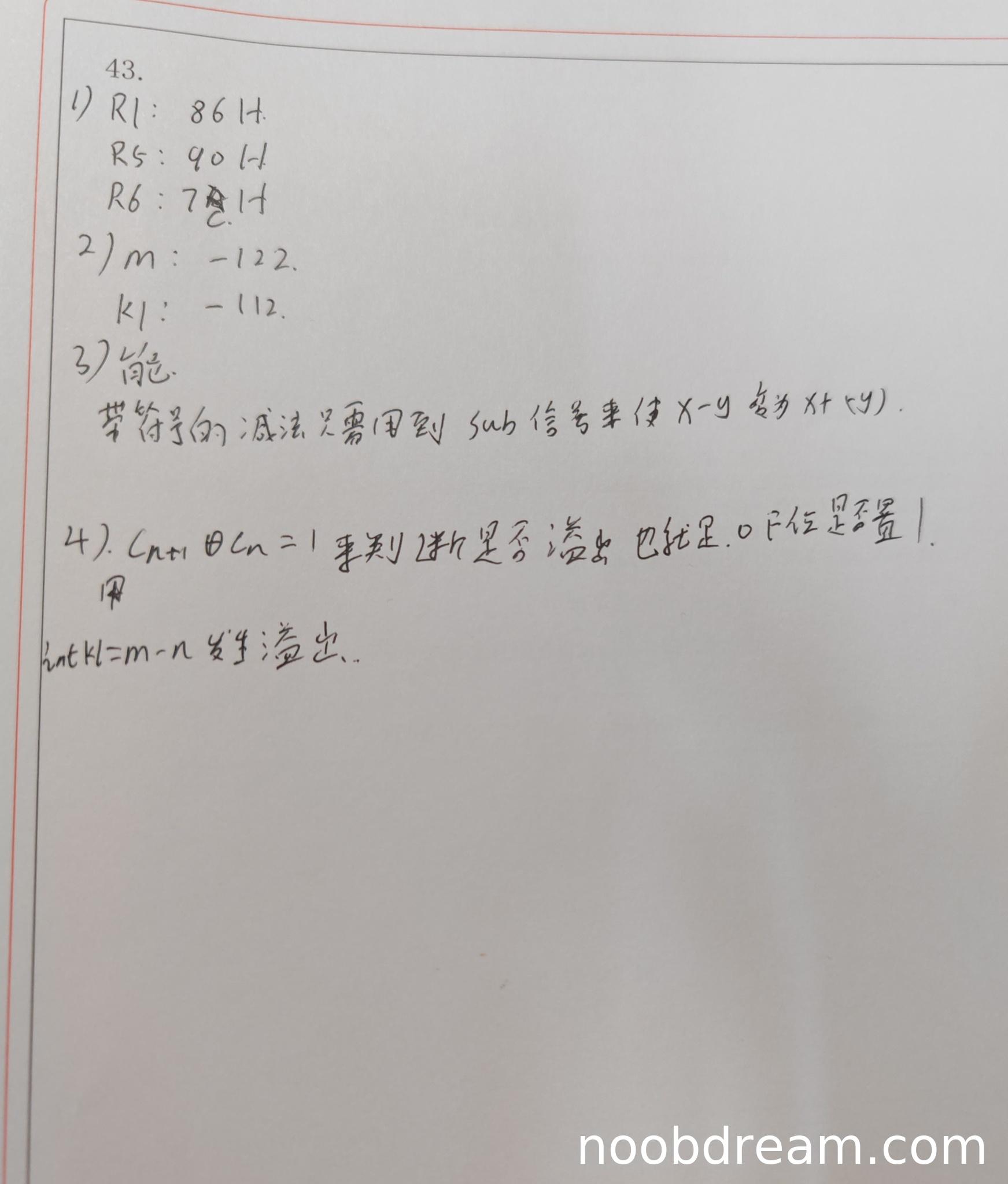 学生第一次识别结果中,R1=861H(应为86H)、R5=901H(应为90H)、R6=7 H(应为7CH)均存在错误;第二次识别结果中,R1=86H正确,R5=90H正确,但R6=78H错误(应为7CH)。两次识别中R1和R5在第二次正确,但R6两次均错误,因此R6部分不得分。R1和R5正确各得1分,R6错误扣1分。本小题得2分。