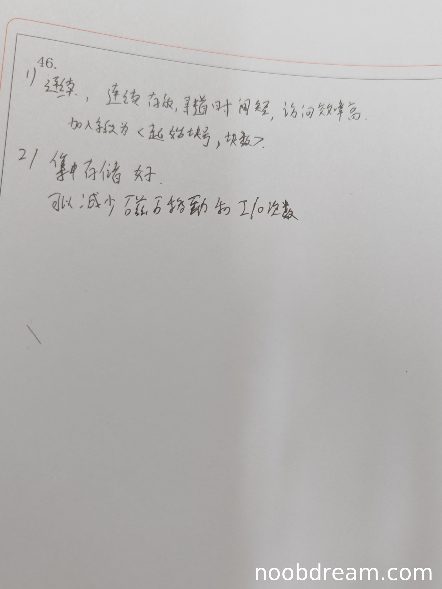 学生答案正确选择了集中存储方式,并给出了理由(可以减少磁盘移动的I/O次数),这与标准答案中"最大化减少了磁头移动和磁盘I/O次数"的核心思想一致。虽然表述比标准答案简略,但核心逻辑正确。因此本小题得3分。