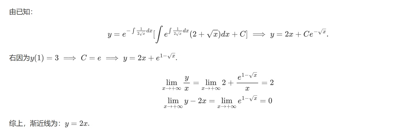 学生正确使用了一阶线性微分方程的求解公式,计算积分过程正确,得到通解 \( y = 2x + Ce^{-\sqrt{x}} \) 与标准答案等价。利用初始条件 \( y(1) = 3 \) 解得 \( C = e \),得到特解 \( y = 2x + e^{1 - \sqrt{x}} \),与标准答案 \( y(x) = e^{-\sqrt{x}}(2xe^{\sqrt{x}} + e) \) 完全一致(经化简可验证)。此部分无错误,得4分。