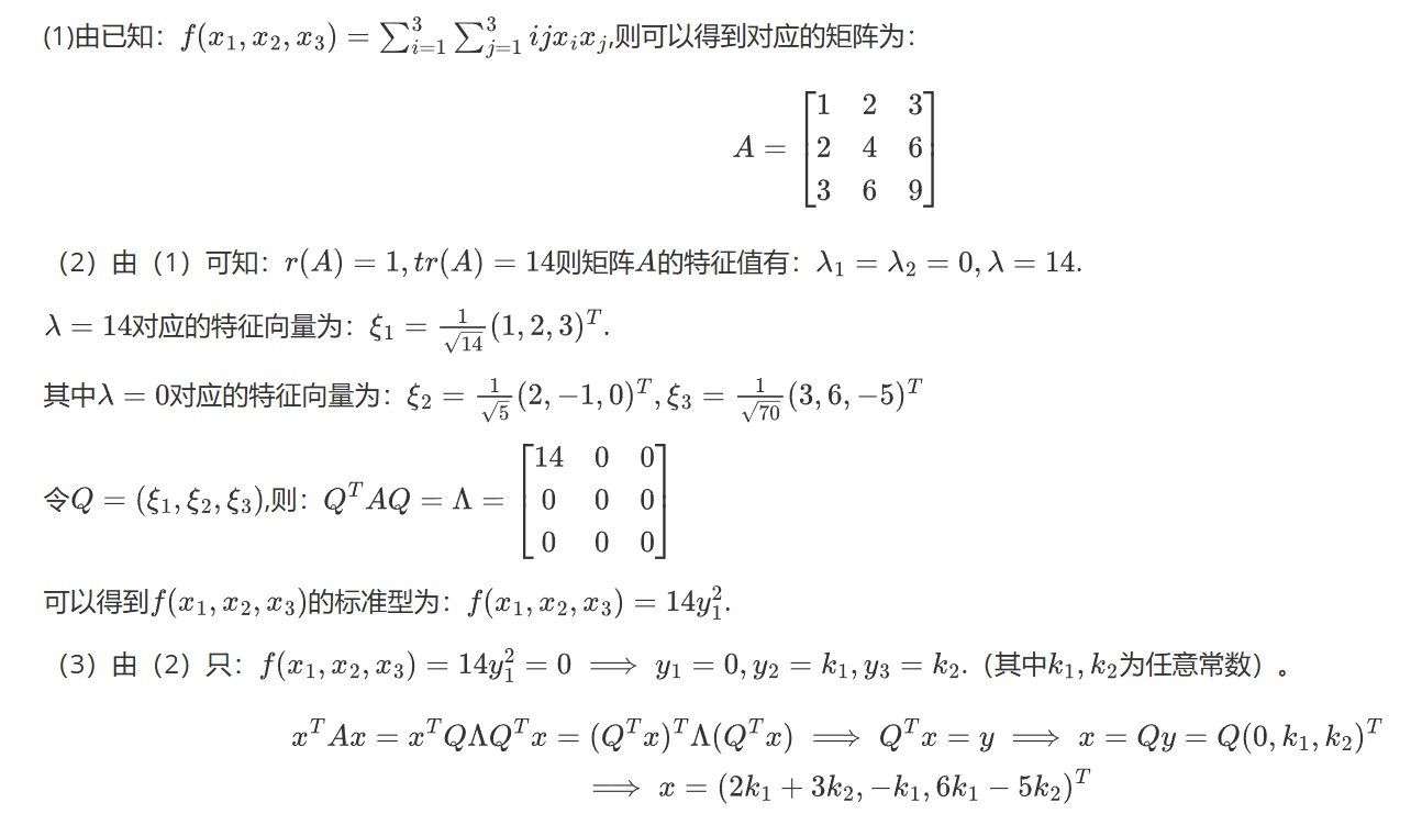 学生正确指出矩阵的秩为1、迹为14,并得出特征值为14,0,0。特征向量 \(\xi_1\) 正确,但 \(\xi_2\) 和 \(\xi_3\) 的符号与标准答案相反(标准答案为 \((-2,1,0)^T\) 和 \((-3,-6,5)^T\),学生为 \((2,-1,0)^T\) 和 \((3,6,-5)^T\))。由于特征向量可以相差一个负号,这属于等价形式,不扣分。正交矩阵 \(Q\) 的构造和标准型推导正确。得4分。