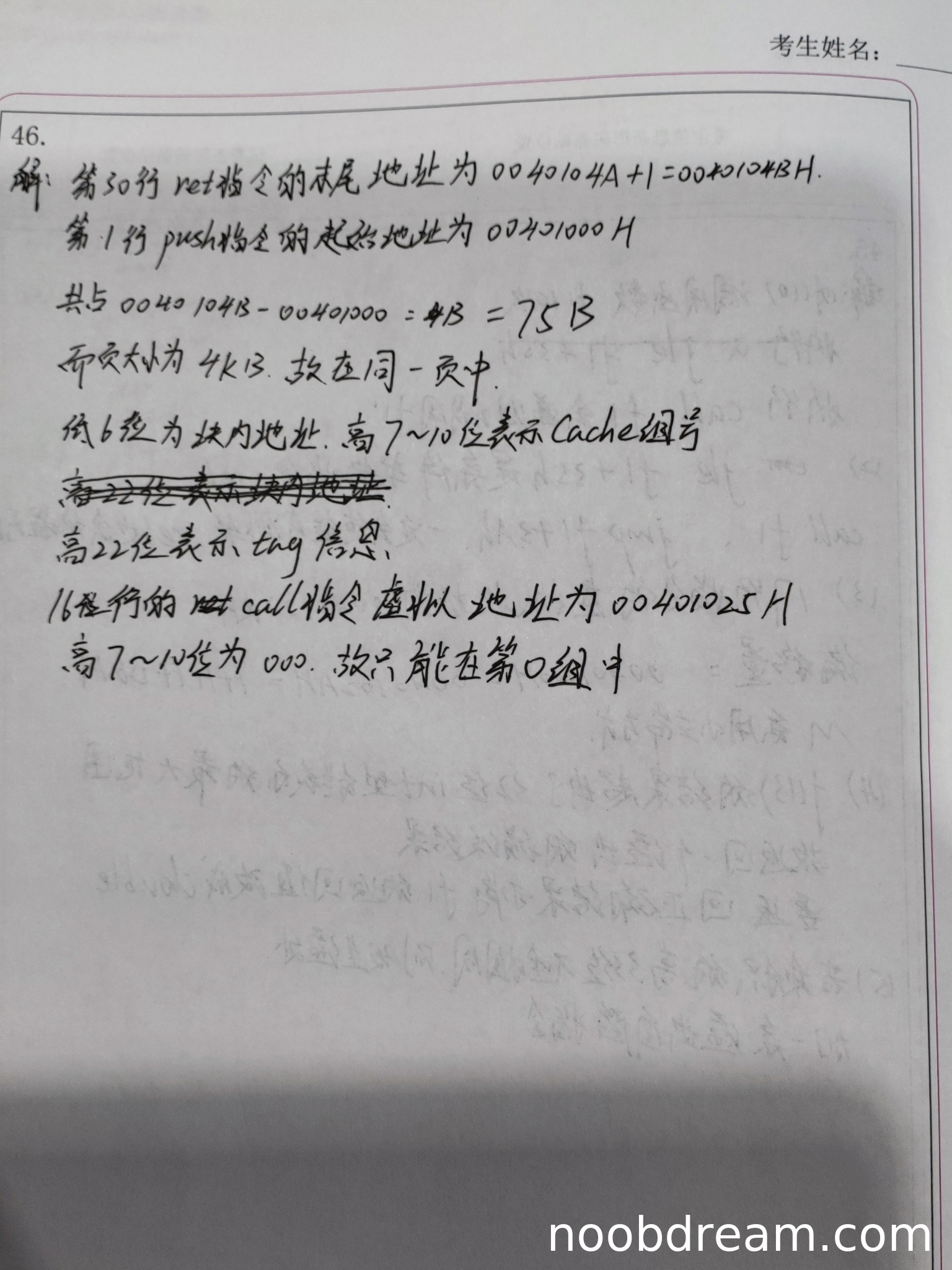 学生回答第1行push指令和第30行ret指令在同一页中,结论正确。但给出的理由存在逻辑错误:计算两条指令之间的字节数为75B(实际应为4BH-00H=4BH=75D,但这里计算方式不严谨,且未直接说明虚页号相同)。标准答案通过虚页号相同来证明,更为严谨。由于结论正确但理由不充分,扣1分。得分:1分。