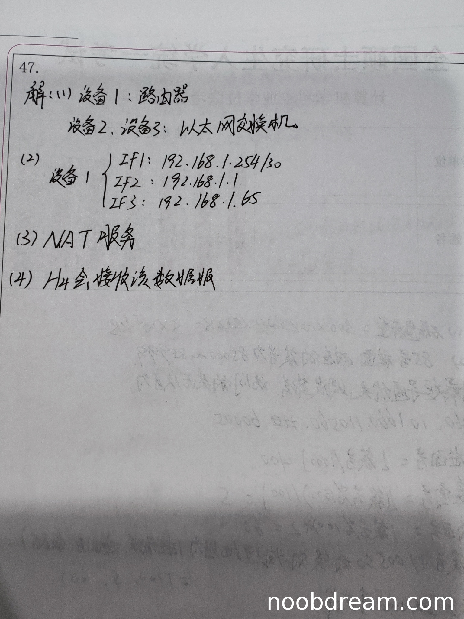 学生答案正确指出设备1为路由器,设备2和设备3为以太网交换机,与标准答案完全一致。得3分。