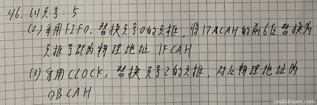 学生正确指出采用CLOCK算法时替换页号2的页框,并给出物理地址0BCAH,与标准答案一致。得3分。