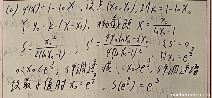 学生正确建立了微分方程 \(x = y - xy'\),并化为标准形式 \(y' - \frac{1}{x}y = -1\)。求解过程中得到通解 \(y = -x \ln x + cx\)(等价于 \(x(C - \ln x)\)),并利用条件 \(y(e^2) = 0\) 求出 \(c = 2\),最终结果为 \(y(x) = -x \ln x + 2x\)(与标准答案 \(y(x) = x(2 - \ln x)\) 等价)。
