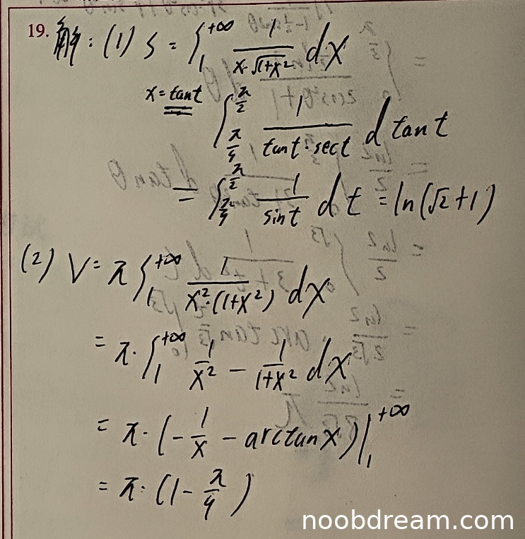 第1次识别中,被积函数写为 \(\frac{dx}{x\sqrt{x^{2}+x^{2}}}\) 显然是识别错误(应为 \(\frac{dx}{x\sqrt{1+x^{2}}}\)),但后续代换过程和计算正确,得到正确结果 \(\ln(\sqrt{2}+1)\)。第2次识别中被积函数正确,代换过程完整且计算正确。两次识别中至少有一次完全正确,且最终答案正确,因此不扣分。得6分。