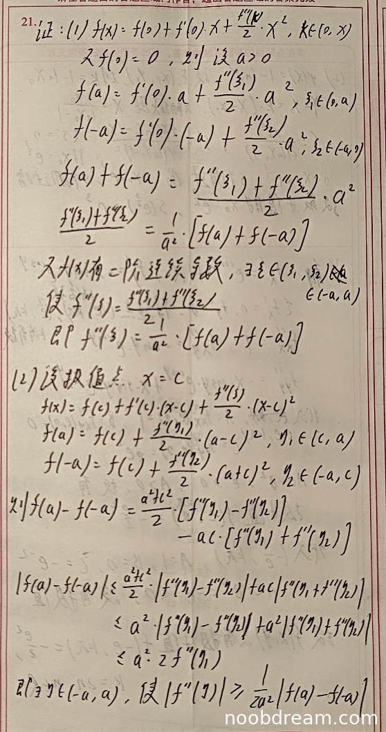 学生答案思路正确:在极值点c处进行泰勒展开,分别代入x=a和x=-a,然后相减得到f(a)-f(-a)的表达式。但在后续推导中存在逻辑错误: