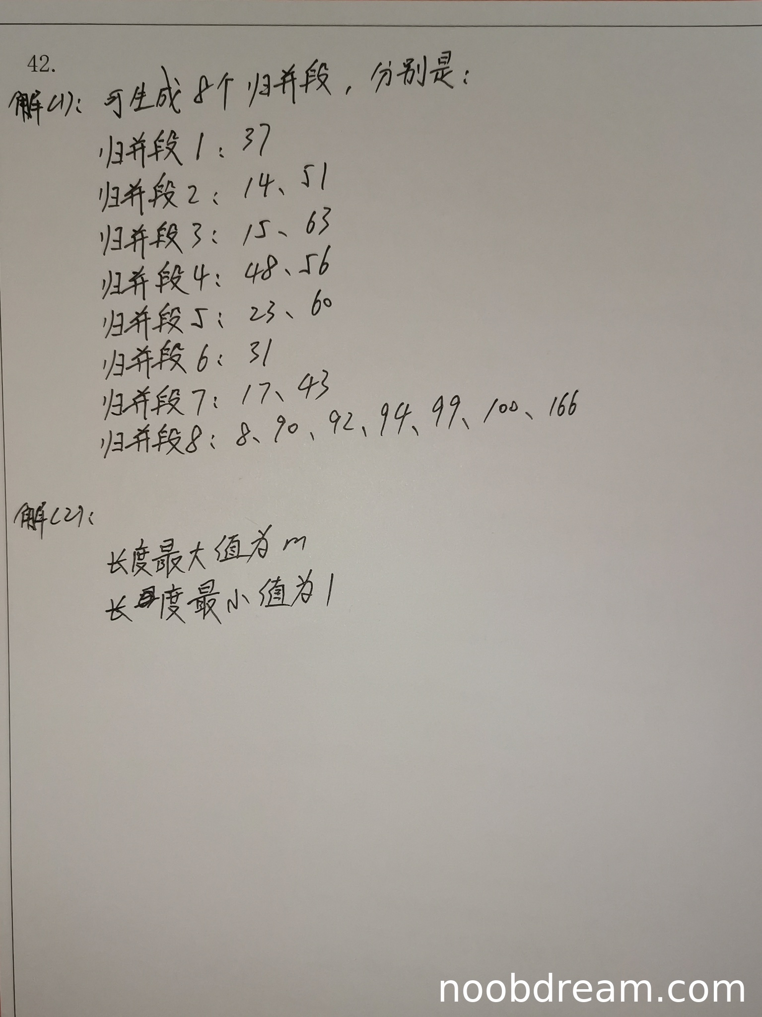 学生答案中第一个初始归并段的最大长度给出为m,最小长度给出为1。根据置换-选择排序原理,第一个初始归并段的最大可能长度确实为n(当输入已有序时),最小可能长度为m(当输入逆序时)。学生将最大值误写为m,属于逻辑错误;最小值1不符合算法特性,工作区大小为m时最小归并段长度至少为m。因此,本小题得0分。