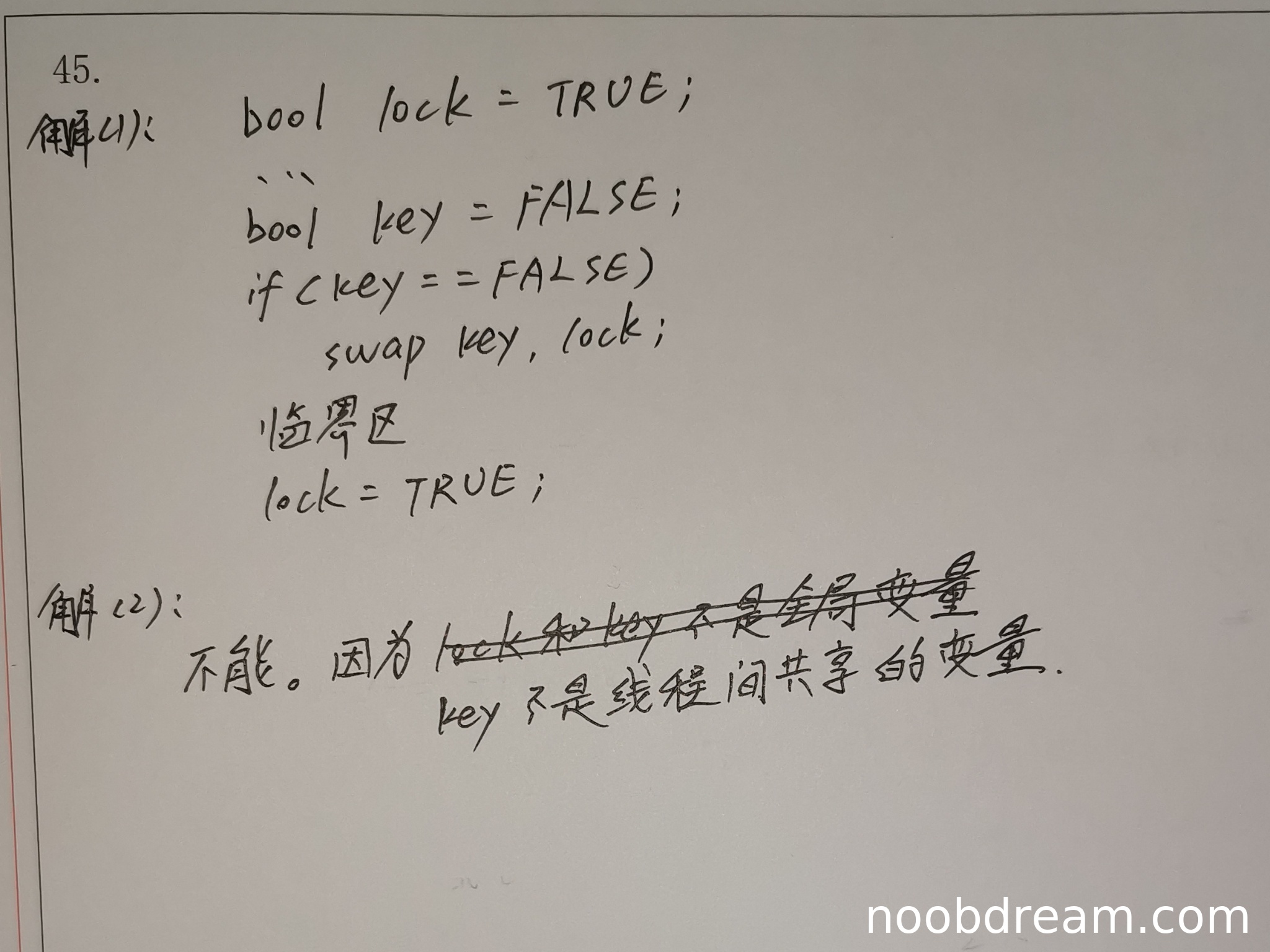 学生回答“不能”,判断正确(1分)。理由部分提到“因为lock和key不是全局变量,key不是线程间共享的变量”,这是错误的理由。标准答案的正确理由是swap指令需要原子性,而函数调用无法保证原子性。学生未能给出正确理由,扣2分。