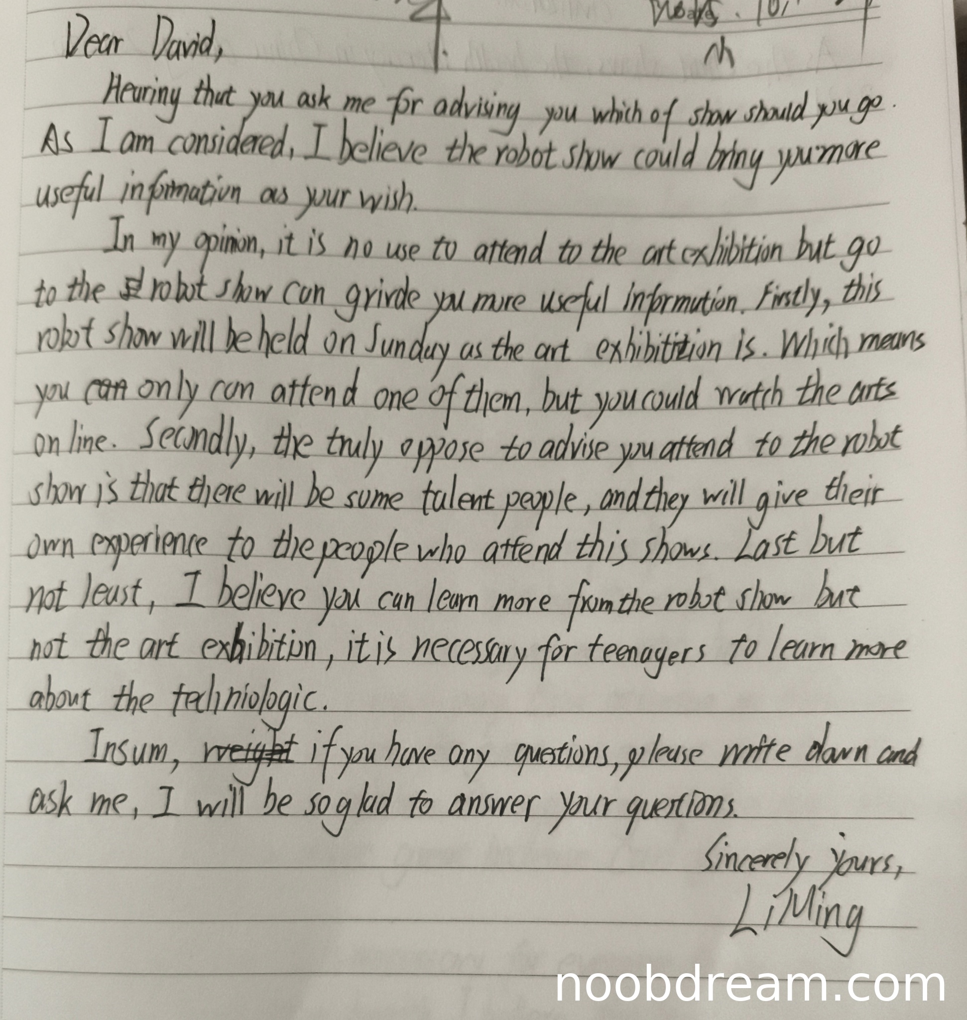 理由:邮件明确提出了建议(参加机器人展),并给出了多个理由(只能参加一个、可以在线看艺术展、机器人展有专家分享经验、能学到更多科技知识)。内容基本覆盖了题目要求的两个要点,但部分理由表述不够清晰(如"truly oppose"用词不当),且存在次要信息冗余。