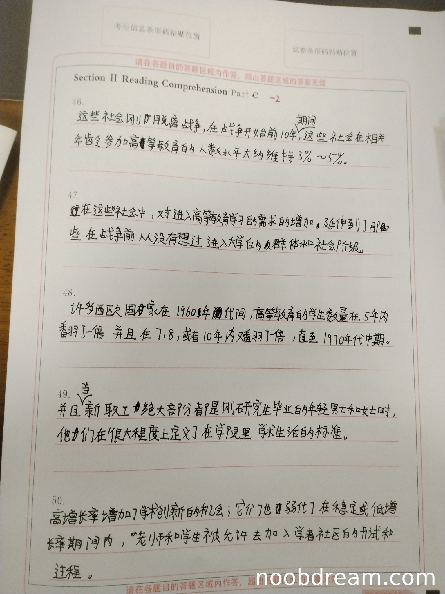 学生作答47题两次识别结果基本正确传达了原文意思,准确表达了"需求增加"和"扩展到战前未考虑上大学的群体"这两个关键点。虽然第二次识别增加了"还"字,但未改变核心逻辑。根据思路正确不扣分原则,得2分。