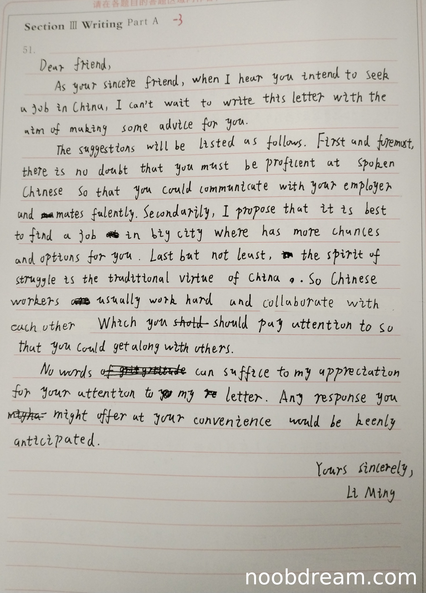 - 内容完整性:作文提供了三条具体建议(提高中文口语能力、选择大城市就业、注意中国职场文化),覆盖了题目要求的所有要点,内容完整。