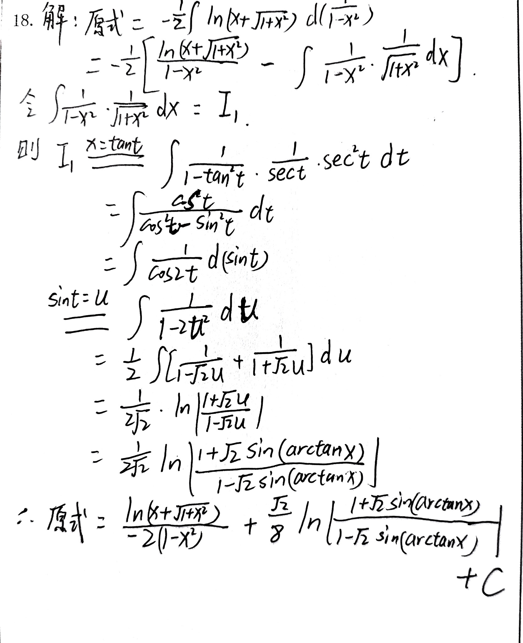 学生通过代换 \( x = \tan t \) 计算 \( I_1 = \int \frac{1}{1 - x^2} \cdot \frac{1}{\sqrt{1 + x^2}} dx \),步骤正确: \[ I_1 = \int \frac{\cos t}{\cos^2 t - \sin^2 t} dt = \int \frac{1}{\cos 2t} d(\sin t) \] 再令 \( u = \sin t \),得到 \( I_1 = \int \frac{1}{1 - 2u^2} du \)。部分分式分解和积分结果 \( \frac{1}{2\sqrt{2}} \ln \left| \frac{1 + \sqrt{2}u}{1 - \sqrt{2}u} \right| \) 正确。代回 \( u = \sin t = \frac{x}{\sqrt{1 + x^2}} \) 也正确。但学生最终表达式为 \( \frac{1}{2\sqrt{2}} \ln \left| \frac{1 + \sqrt{2} \sin(\arctan x...