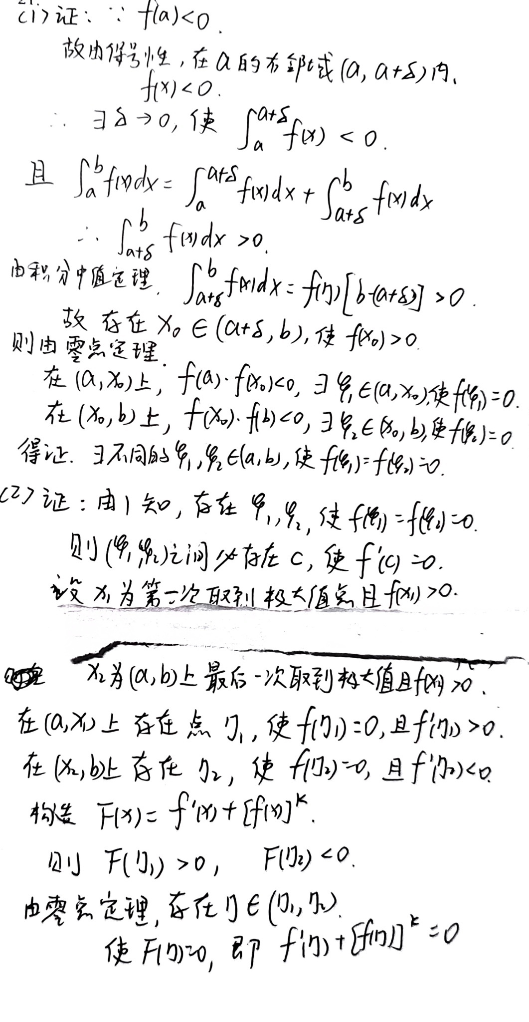 学生作答中,第一部分证明存在两个不同的零点。思路基本正确:通过积分中值定理和零点定理证明存在一点使得函数值为正,再分别在两个区间上应用零点定理得到两个零点。但证明中存在以下问题: