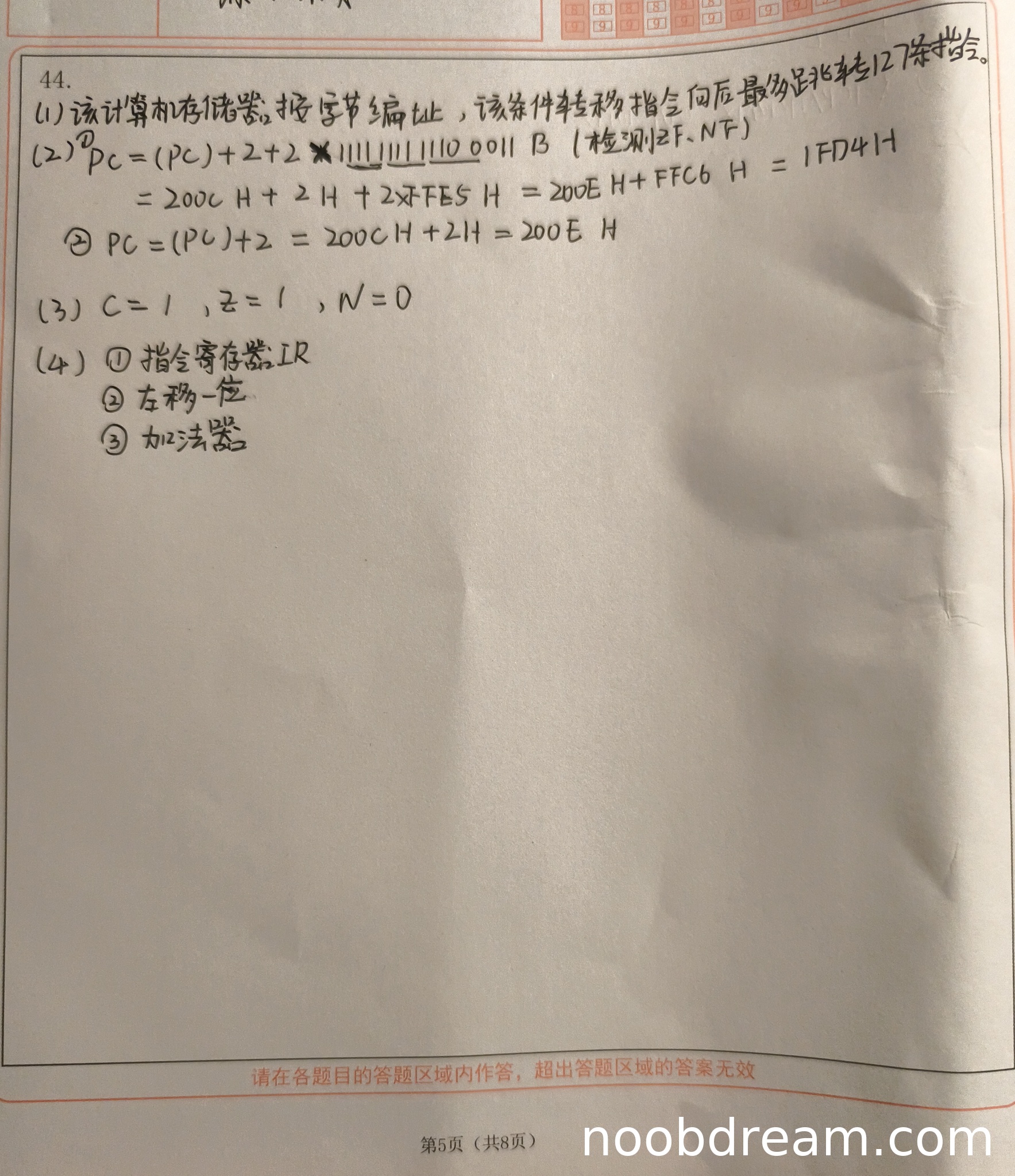 - 当CF=0, ZF=0, NF=1时,正确计算转移目标地址为1FD4H(2分)
