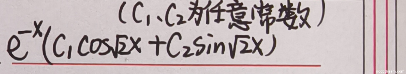 学生作答与标准答案完全一致,通解形式为 \( y = e^{-x}(C_1\cos\sqrt{2}x + C_2\sin\sqrt{2}x) \),且正确标注了 \( C_1, C_2 \) 为任意常数。根据评分要求,答案正确得满分4分。